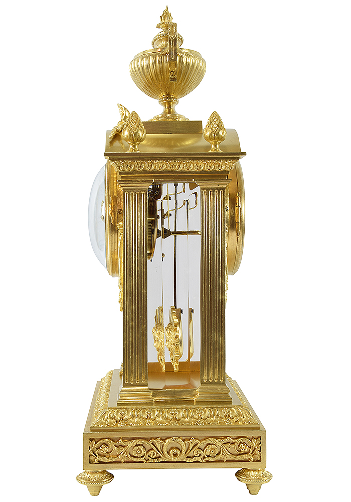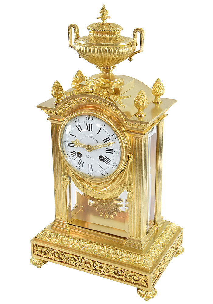 We do not use the term “Restoration”, which implies a significant transformation or major repair that modifies an object’s authenticity or original appearance. Each object is completely dismantled, then thoroughly cleaned part by part; our cleaning technique restores shine without adversely affecting the gold. We then put the clock back together, returning all the various parts to their origin location, as well as all the nuts and screws. Subsequently, the item is inspected to ensure it is perfectly even, symmetrical, and smooth, etc.