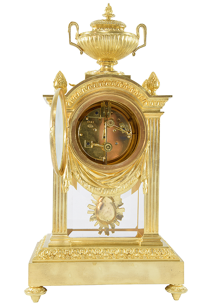 The clock’s movement undergoes a complete overhaul; it is totally dismantled, cleaned and each individual part is polished. The duration of this procedure affects the shine: we prefer to obtain a brilliant shine, in keeping with the gilding of the object. To increase the strength and quality of the gears, we apply a very important procedure, known as bouchonnage, to correct for wear accumulated over years of operation, consisting in the placing cork of stoppers in any pivot holes that have become deformed by wear. After the clock has been completely reassembled, it is tested over a long period of time to ensure that the movement, as well as the hour and half-hour strikes, are operating correctly.