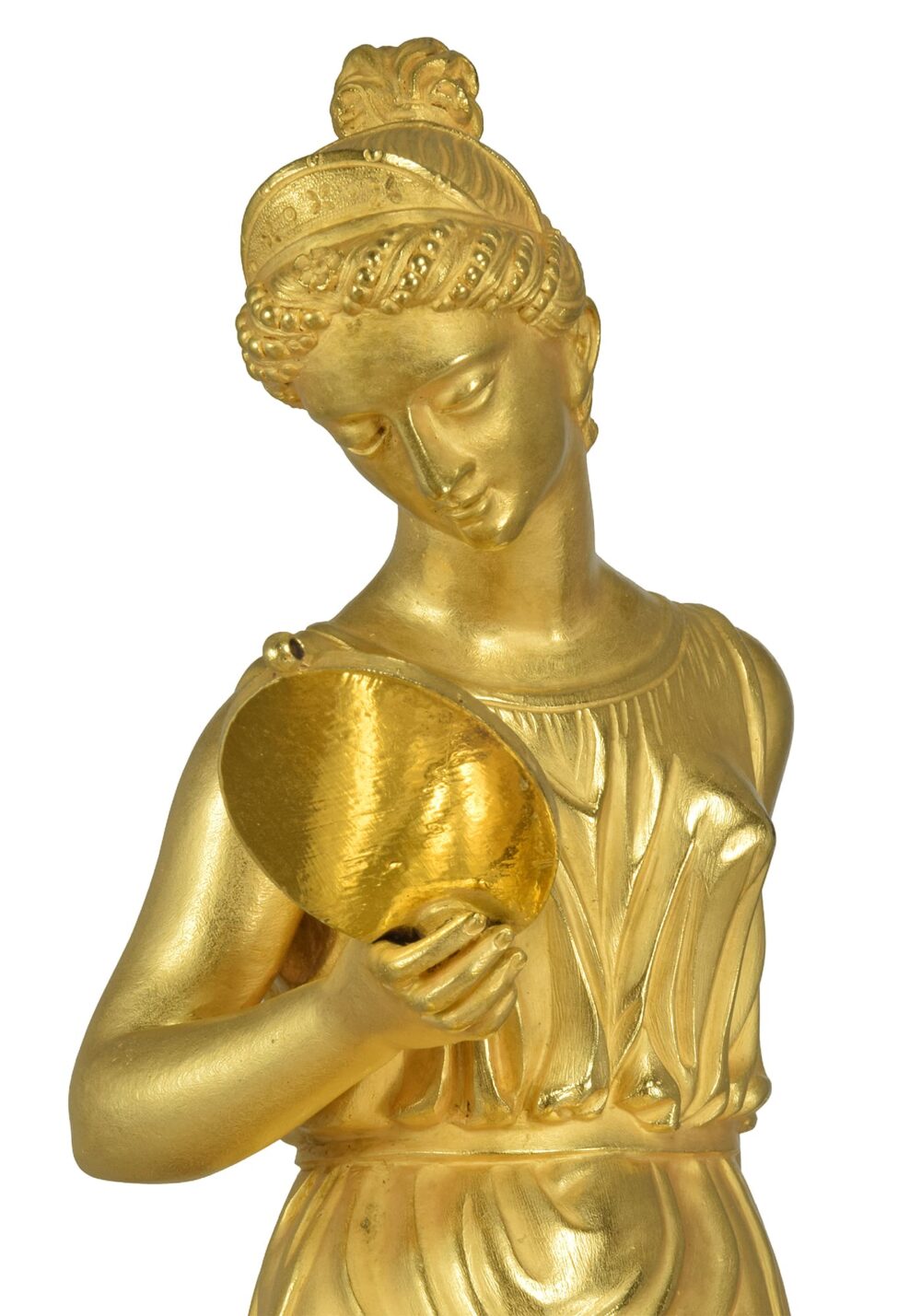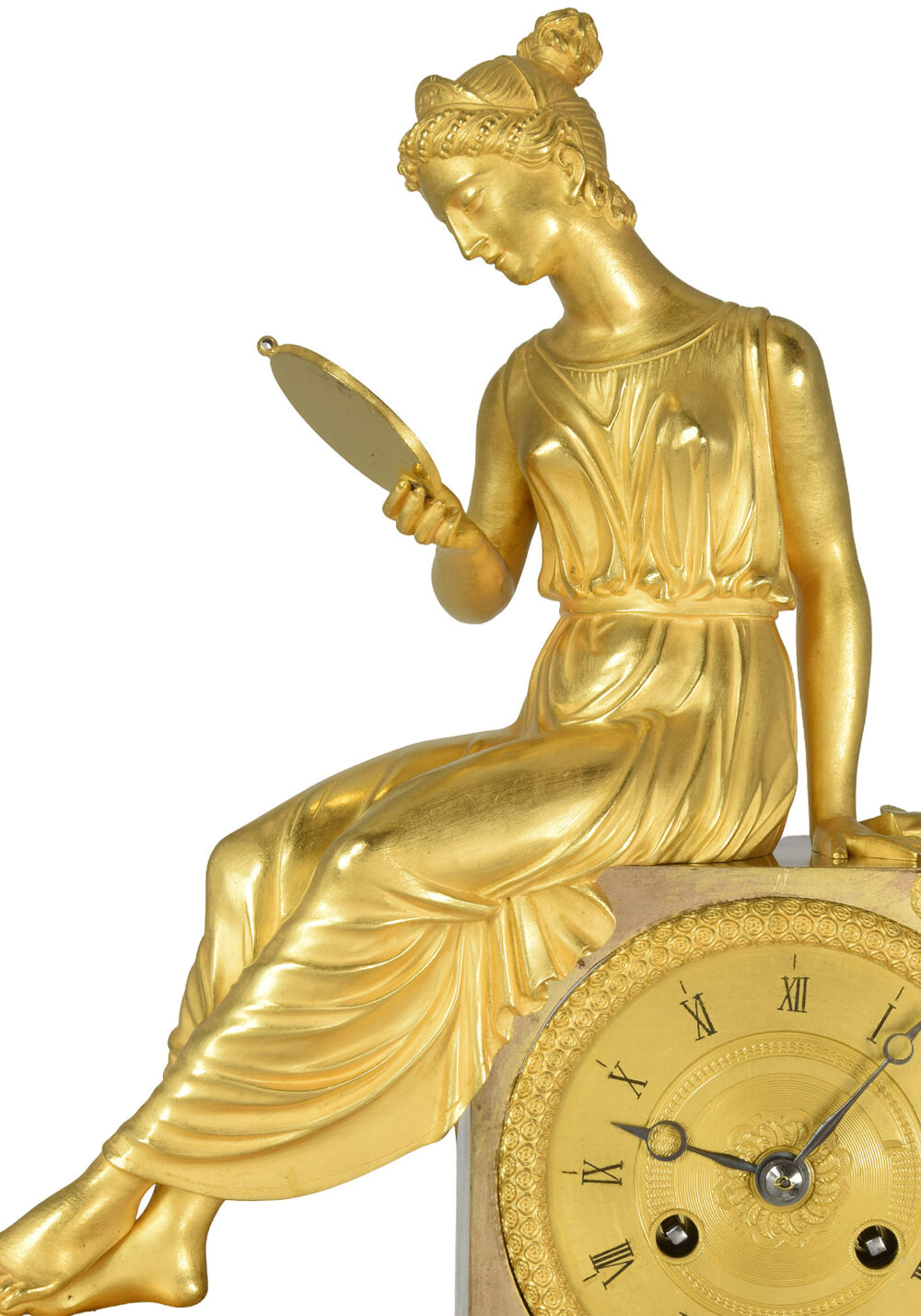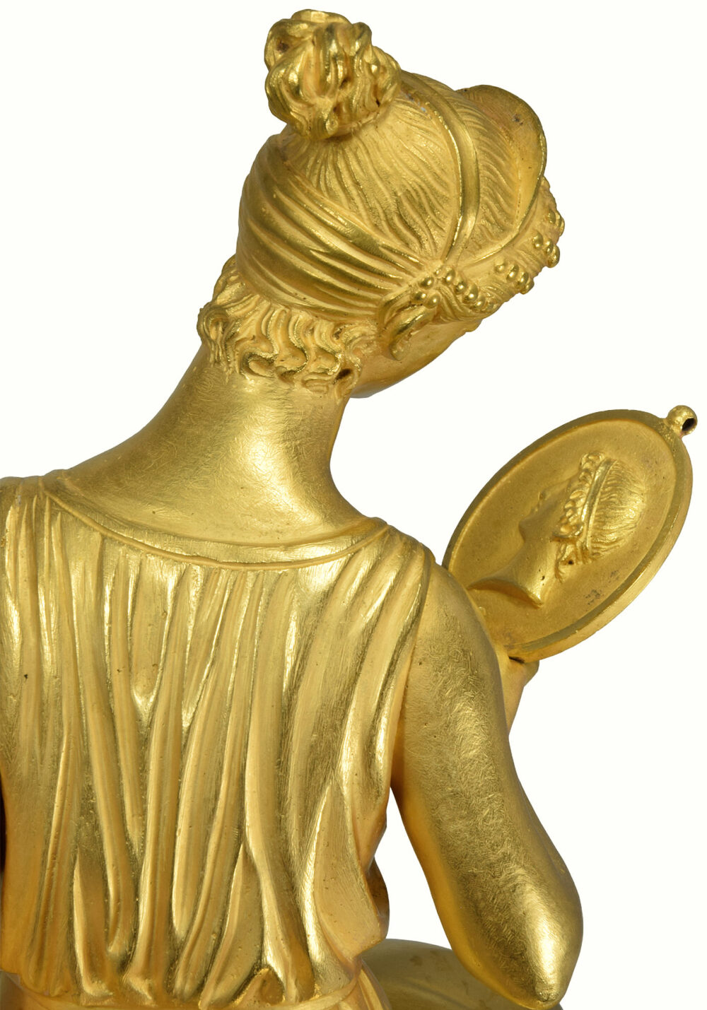 Very beautiful clock from the Restoration period circa 1820. Made of very finely chiseled mercury-gilded bronze. Large female figure with the figure of Laura seated, leaning on her right arm, holding in her left hand a medallion bearing the portrait of Petrarch. Bronze dial highlighted by a guilloché border.