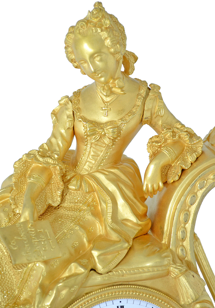 Jeune femme vêtue d’un costume dans la tradition du XVIIème assise sur un siège ou est inscrit le cadran en émail blanc, lecture des heures depuis des aiguilles en bronze finement travaillé.