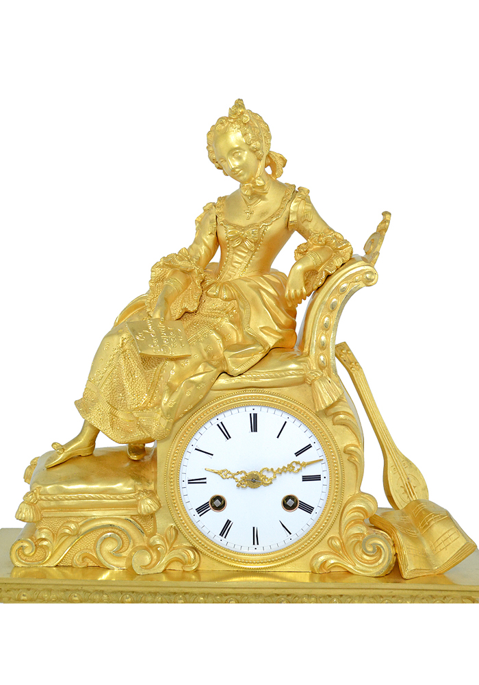 Pendule d’époque Louis-Philippe vers 1840 en bronze doré au mercure sur le thème de l’opéra-comique en hommage à Charles-Simon Favart pour son acte » La Chercheuse d’esprit « représenté pour la première fois le 20 février 1741 à Paris.