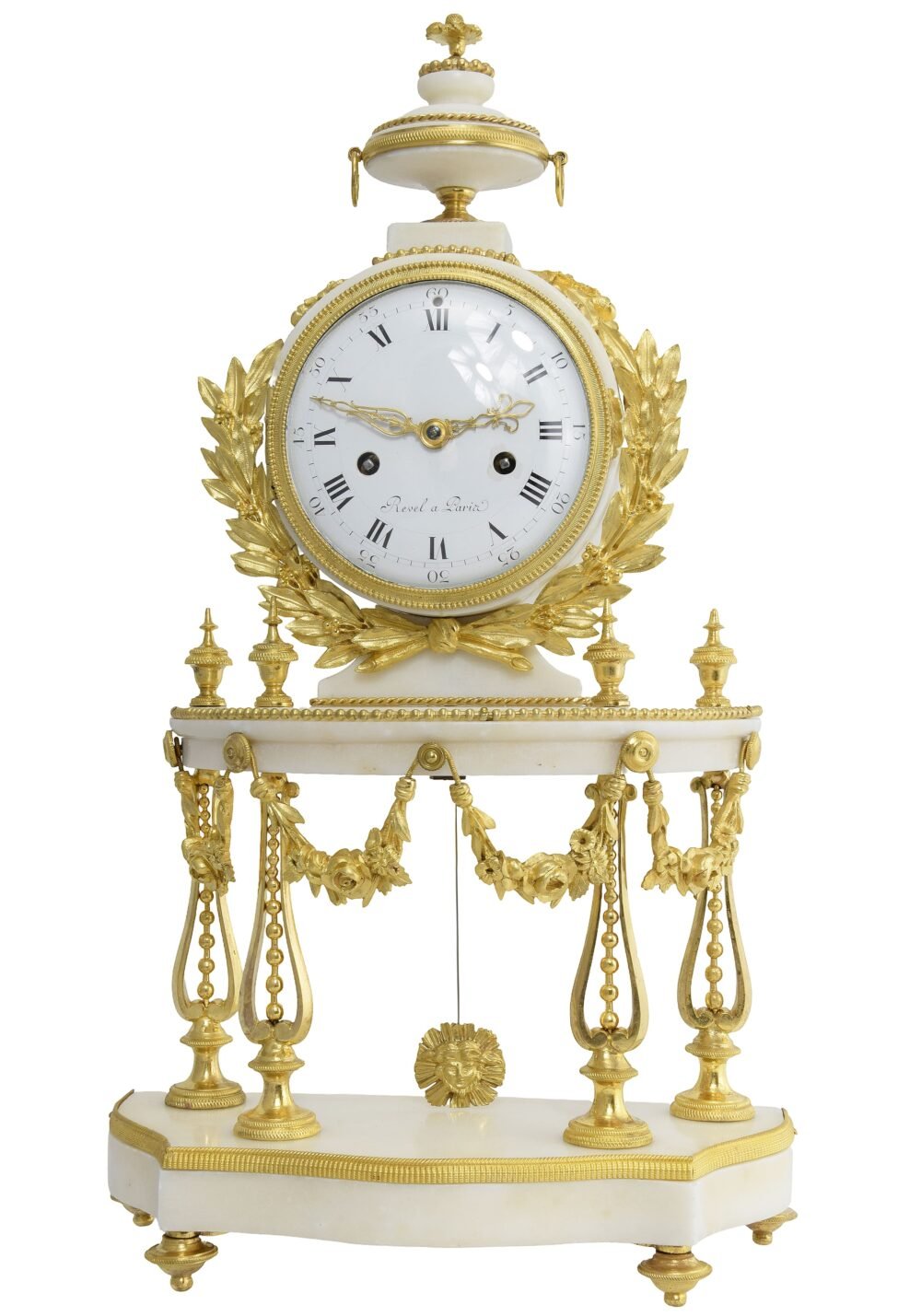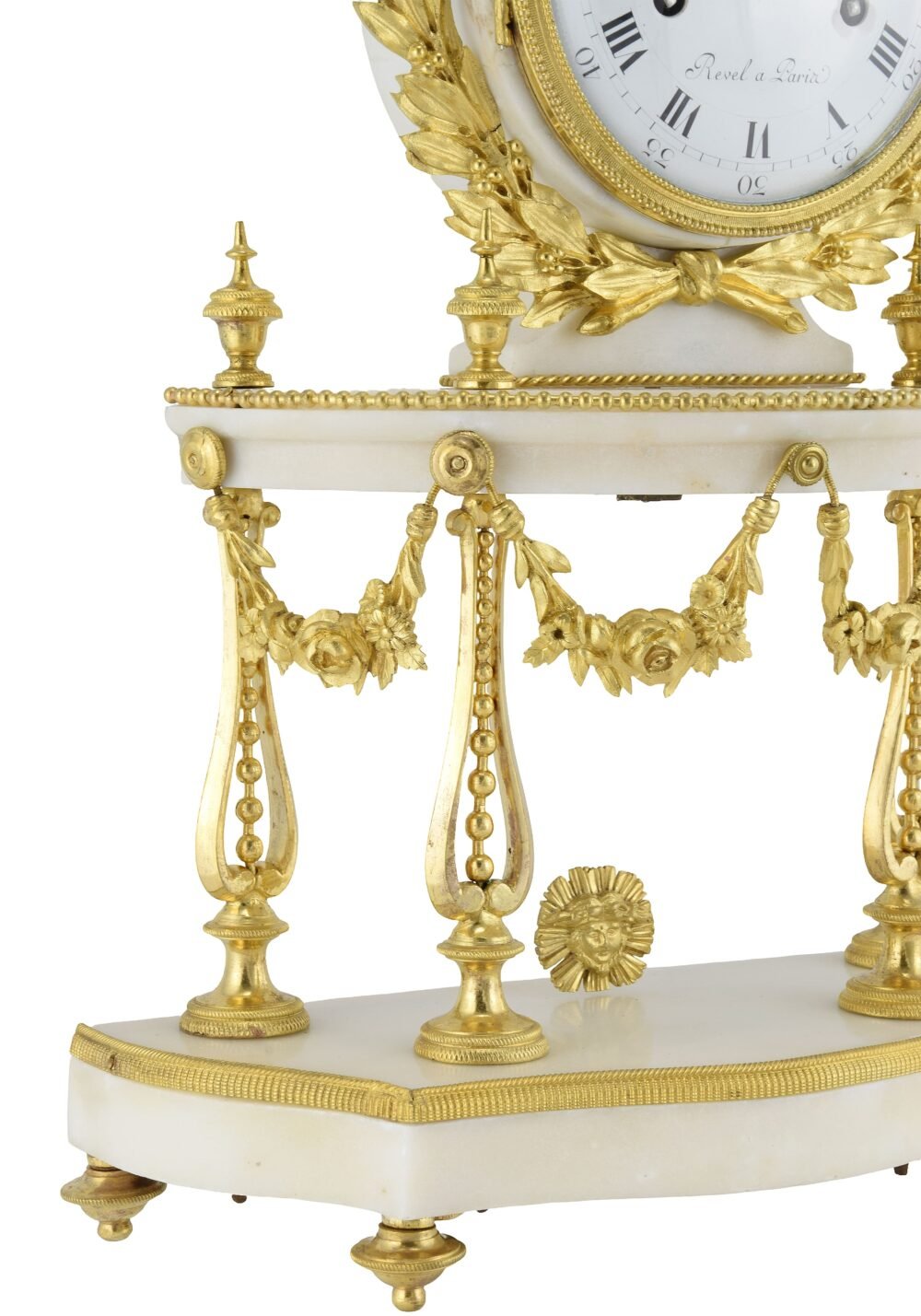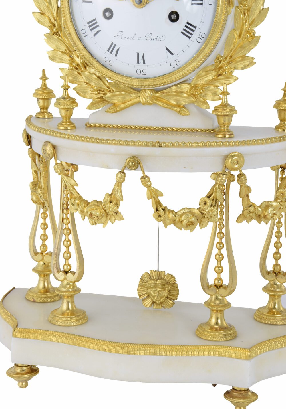 A Louis XVI period portico clock, 18th century, circa 1780. Made of white marble and mercury-gilt bronze, it features an elegant half-moon shape. Signed Revel in Paris, a clockmaker listed in Tardy's dictionary of French clockmakers. The domed white enamel dial displays Roman numerals for the hours and a peripheral minute track. It is protected by a gilt bronze bezel set with a domed glass. The clock is in perfect original condition, without alteration.