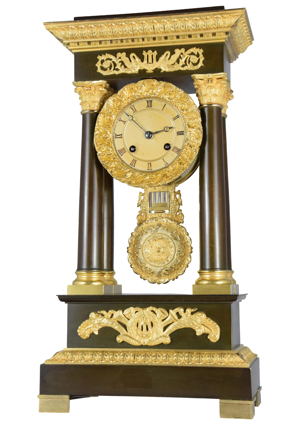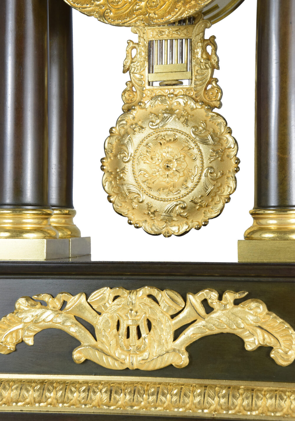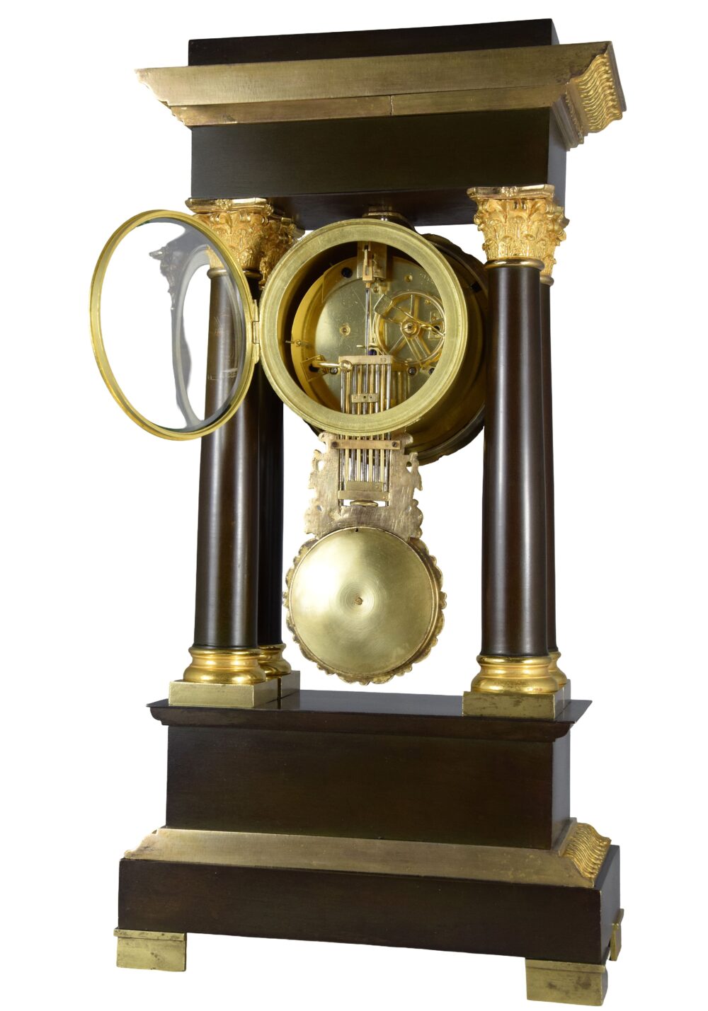 An elegant Charles X period portico clock, circa 1840, signed on the inner mechanism plate "Piolaine," a clockmaker listed in Tardy's Dictionary of French Clockmakers.