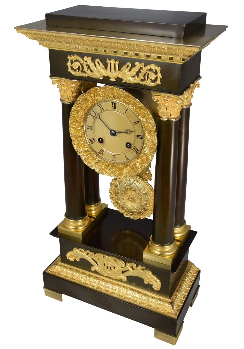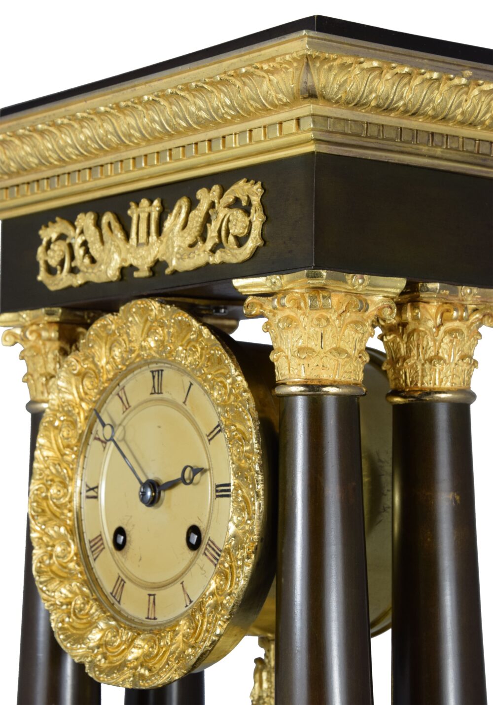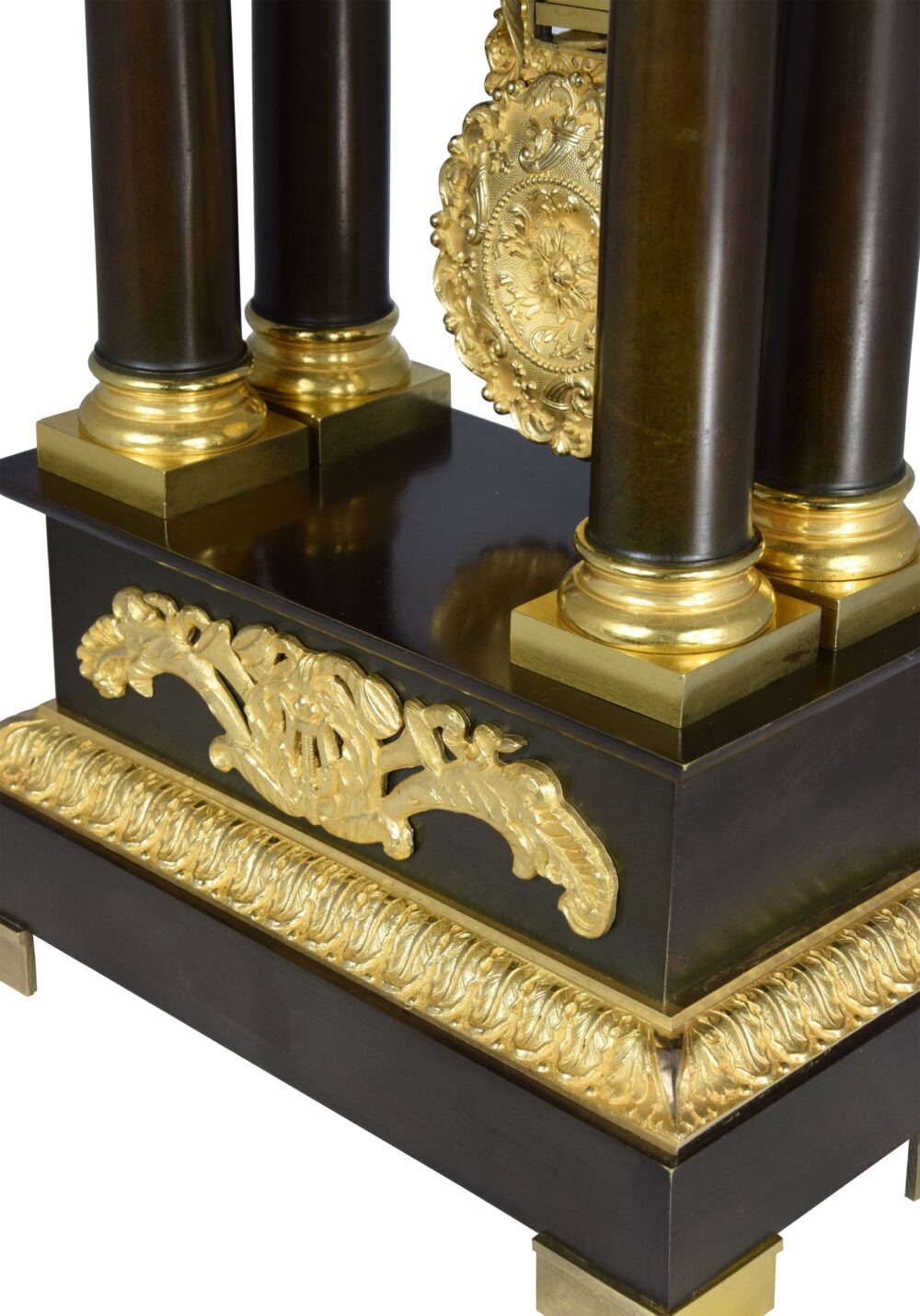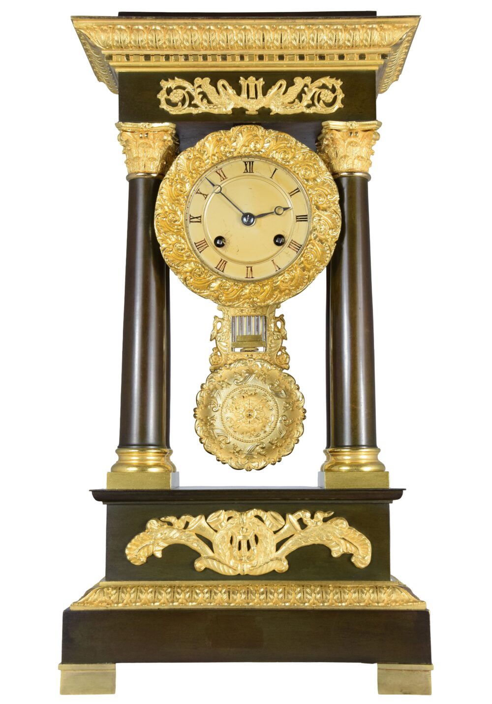 An elegant Charles X period portico clock, circa 1840, signed on the inner mechanism plate "Piolaine," a clockmaker listed in Tardy's Dictionary of French Clockmakers.