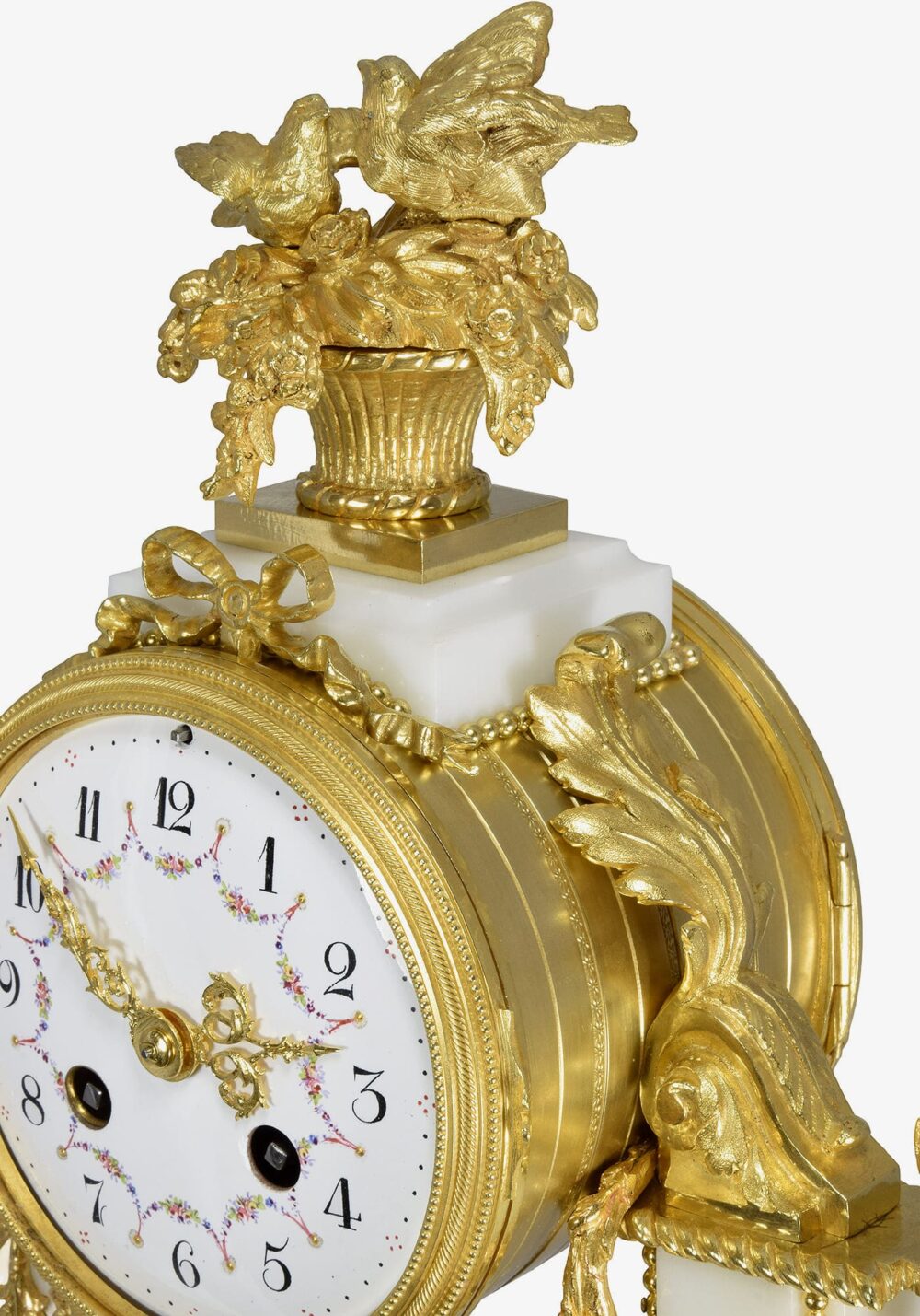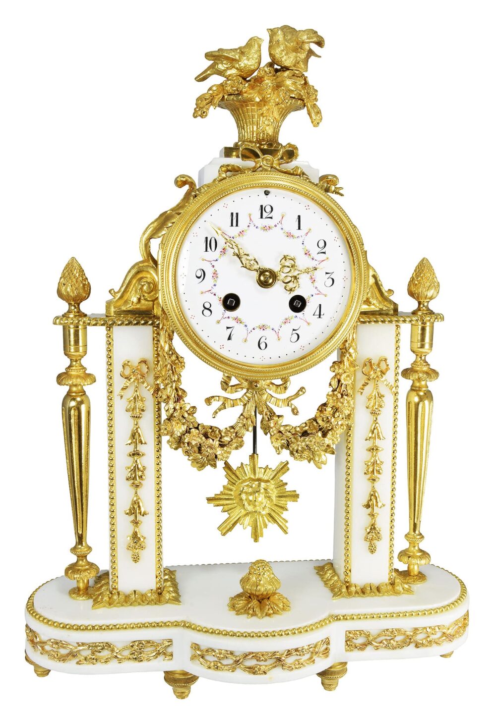 An elegant mantel clock in the Louis XVI style, dating from the Napoleonic III era, circa 1860. Made of Carrara white marble with rich, high-quality gilded bronze ornamentation. The design features two pairs of columns, embellished with bead motifs and draped with floral garlands. Volutes frame the clock face, which is topped by a pair of swallows in a nest. The space between the columns is decorated with a wide, elaborate garland of flowers and a decorative sunburst motif, along with a pinecone resting on the plinth. The base, rounded at the ends and curved at the front, is adorned with a bead motif and further embellished with numerous intertwined floral friezes that follow the shape of the base.