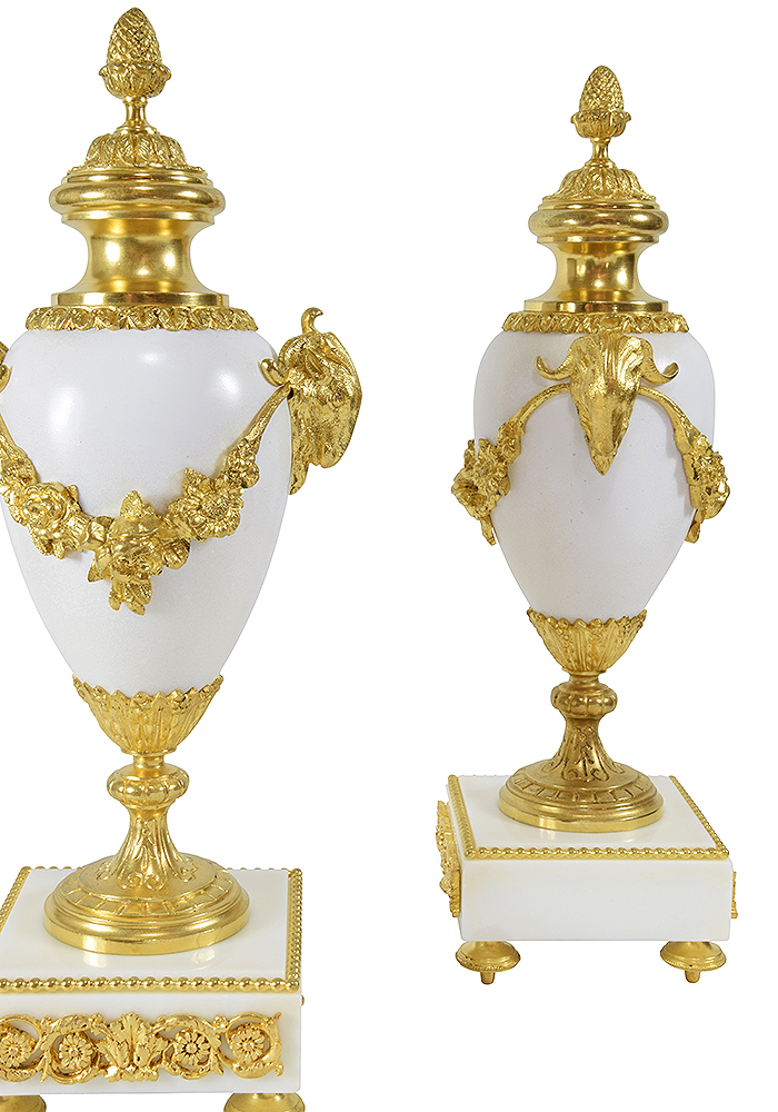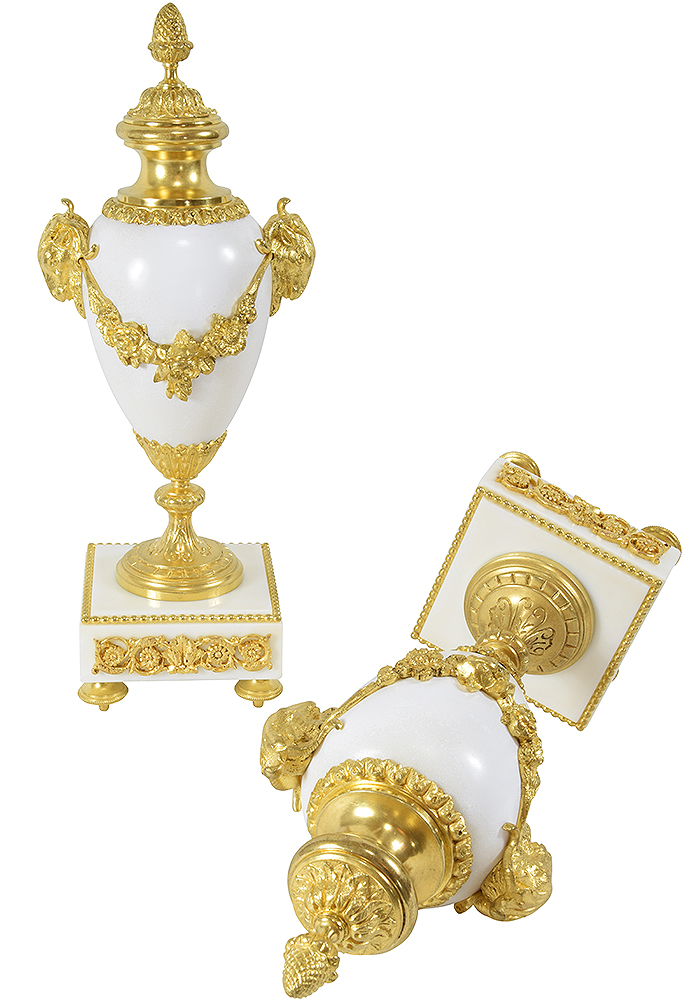 Very nice pair of excellent quality vases in a remarkable state of conservation. Carrara marble architecture and gilded bronze ornamentation, identical decoration front and back. Napoleon III period.