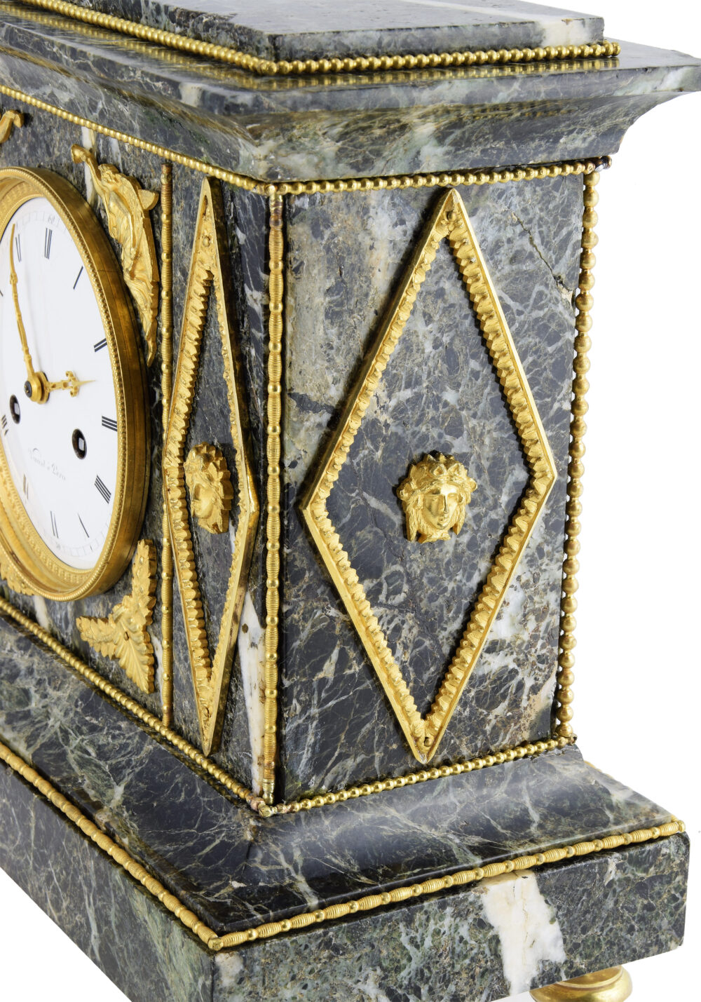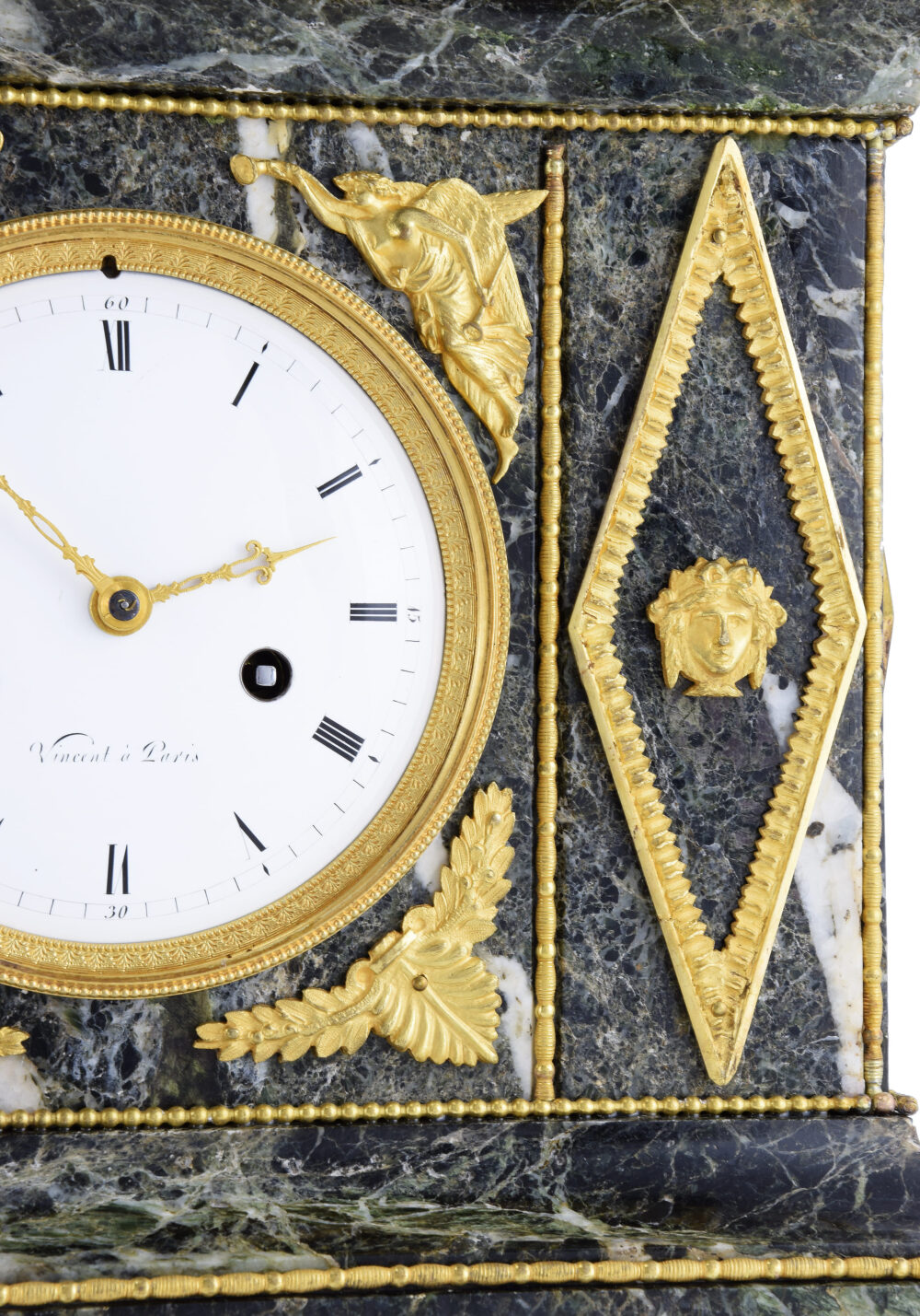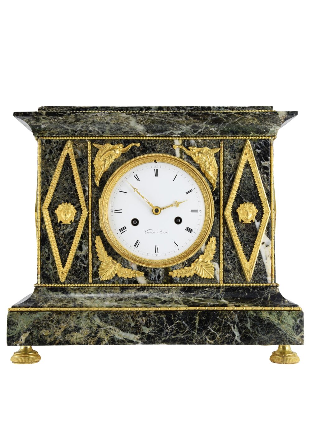 An Empire period clock, circa 1810, attributed to the Parisian clockmaker Vincent. Its rigorous and symmetrical architecture combines sea-green marble with rich, high-quality mercury-gilt bronze ornamentation. Protected by a domed glass, the wide white enamel dial, framed by a bezel decorated with alternating water leaves and small palmettes, is flanked by two winged female figures draped in classical style. Each holds a trumpet of Fame, symbolizing glory and victory; beneath these figures bloom laurel wreaths, emblem of triumph.