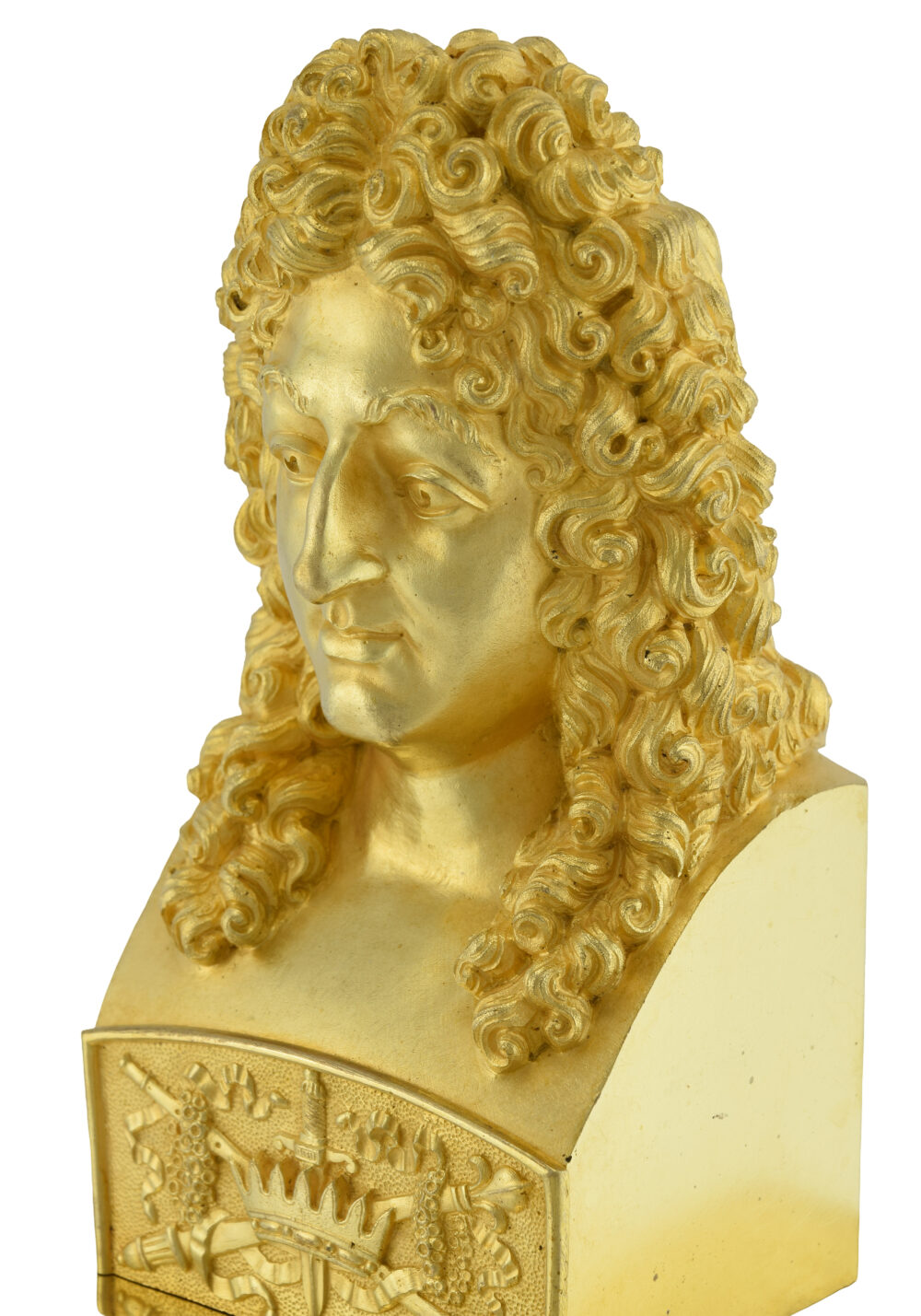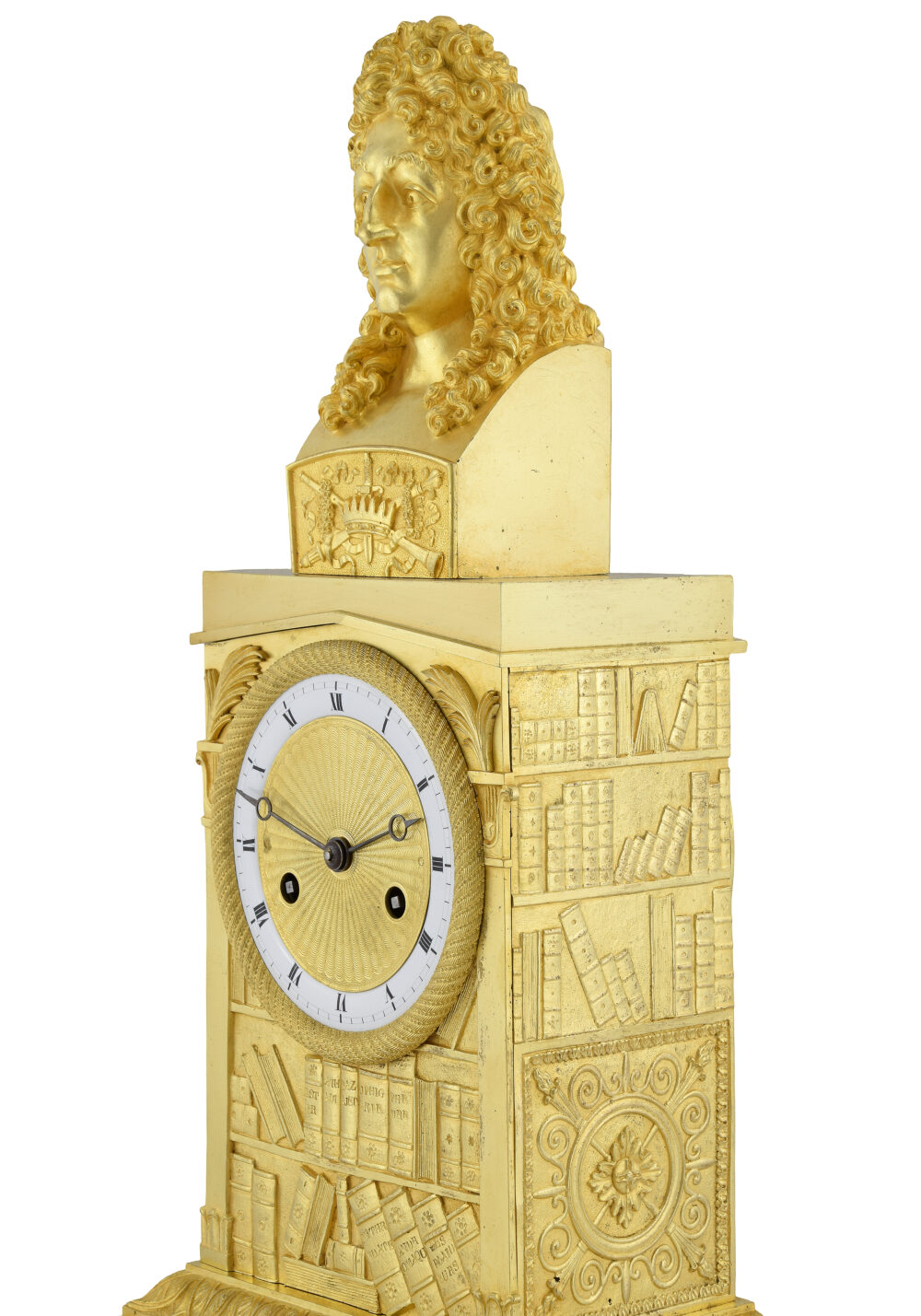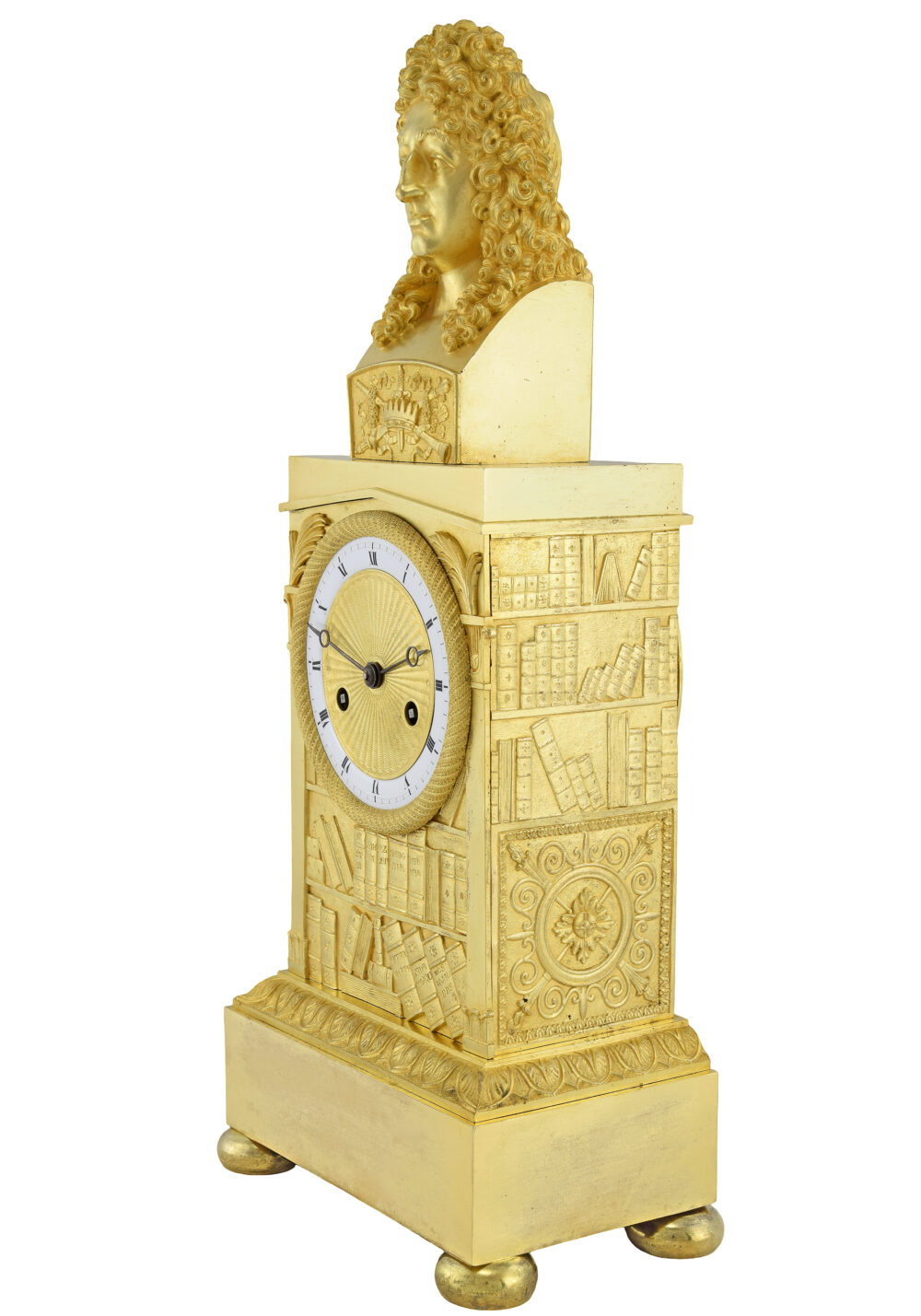 Pendule à l’effigie du poète de Jean Racine ornementé par un buste très finement ciselé, il repose sur une bibliothèque à trois faces dont est inscrit le cadran composé d’un cerclage en émail blanc et au centre d’un médaillon guilloché. En bronze doré au mercure, dorure de qualité, d’époque Charles X vers 1840.