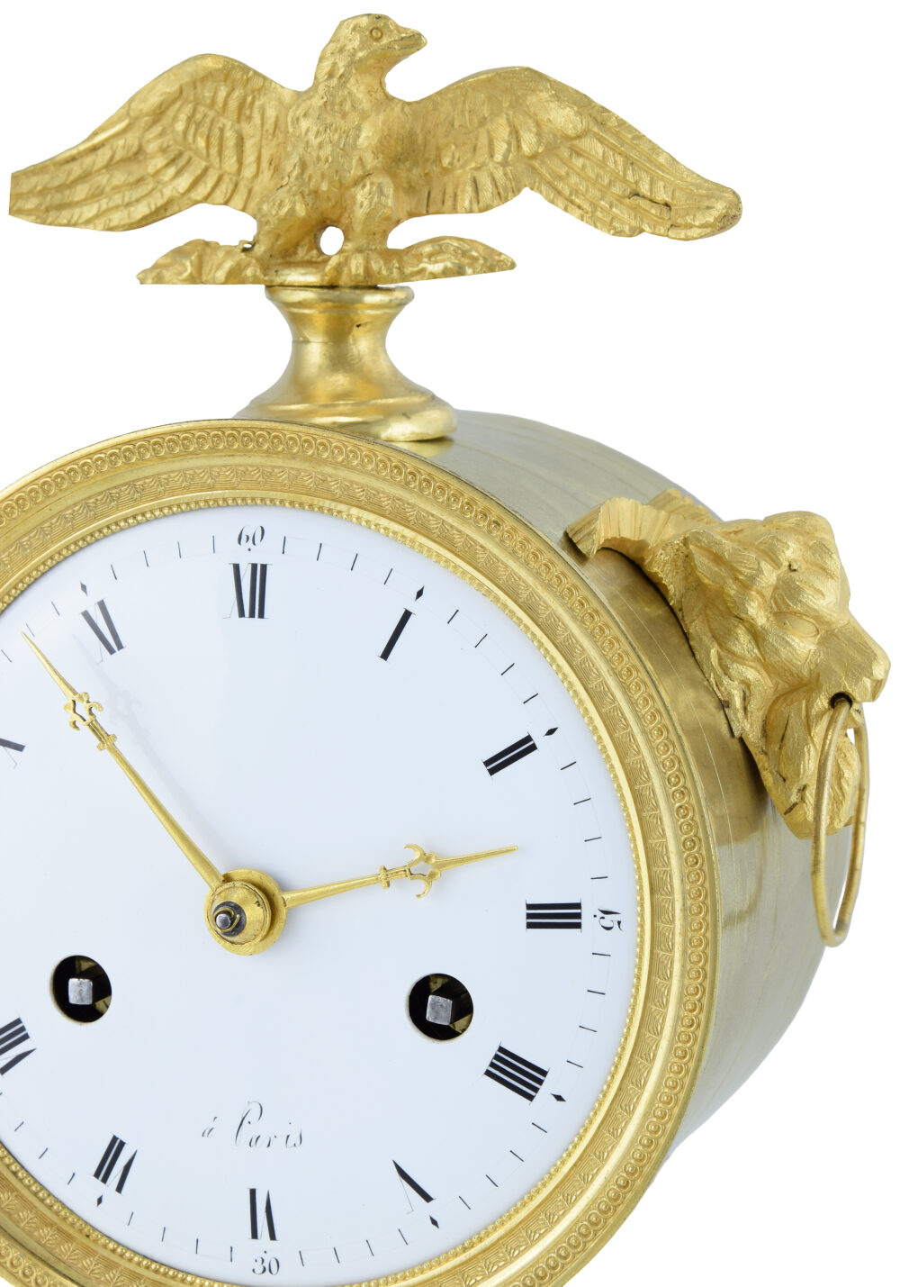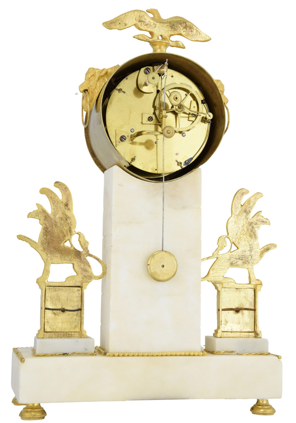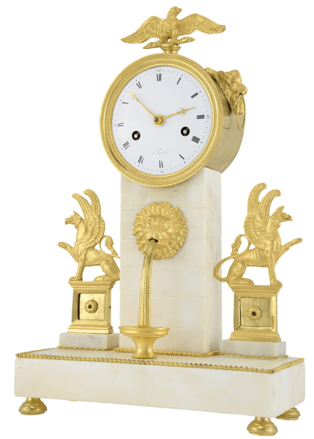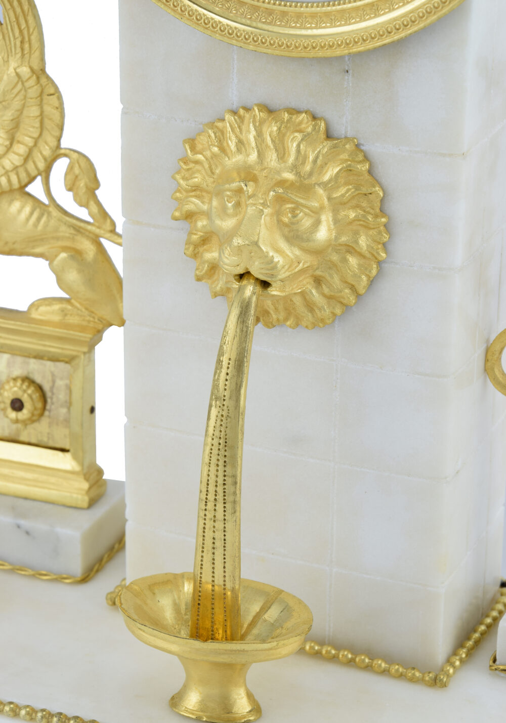 Pendule d’époque Empire vers 1810, intéressant à riches décors finement ciselés en bronze doré au mercure à l’or. Architecture en marbre blanc représentant une fontaine dont la partie centrale en forme de brique accueille une magnifique tête de lion d’où l’eau jailli depuis sa gueule et se déversant dans une vasque, cette fontaine est mise en valeur par deux griffons répartis de chaque côté. Orné au sommet de cette fontaine le cadran bombé en émail blanc accompagné d’aiguilles doré et souligné par un contour de palmette. Le cadran est ornementé de mufles de bélier et au sommet d’un magnifique aigle aux ailes déployées.