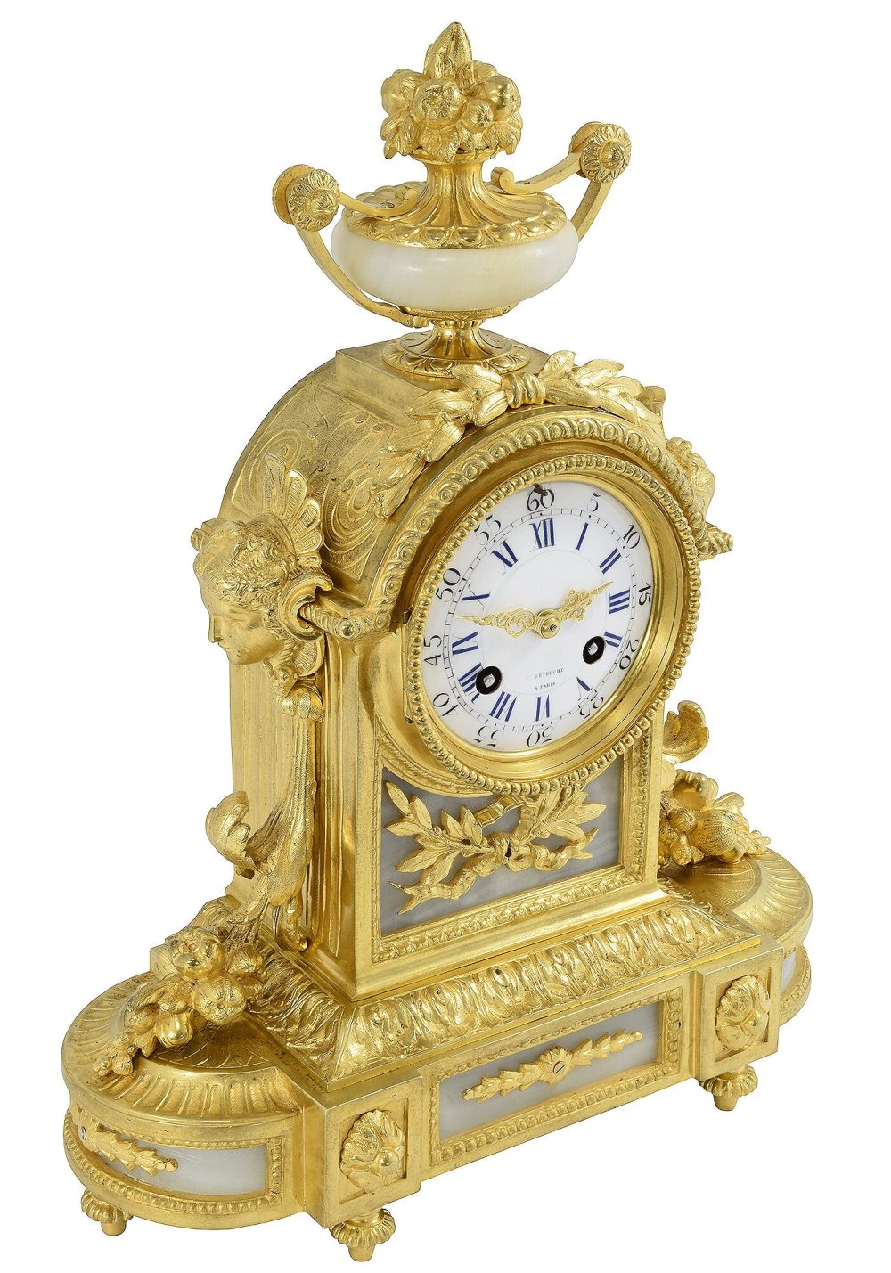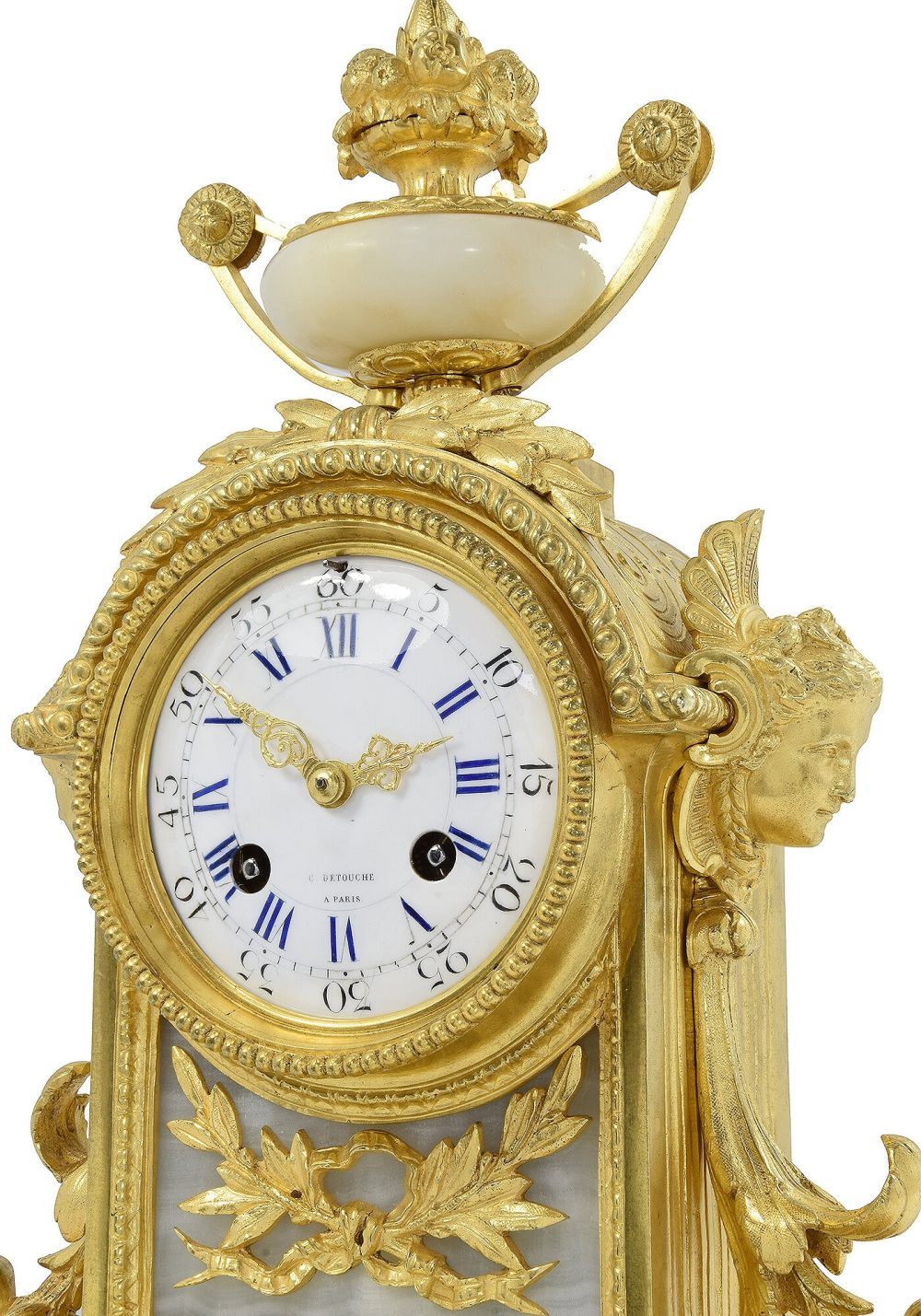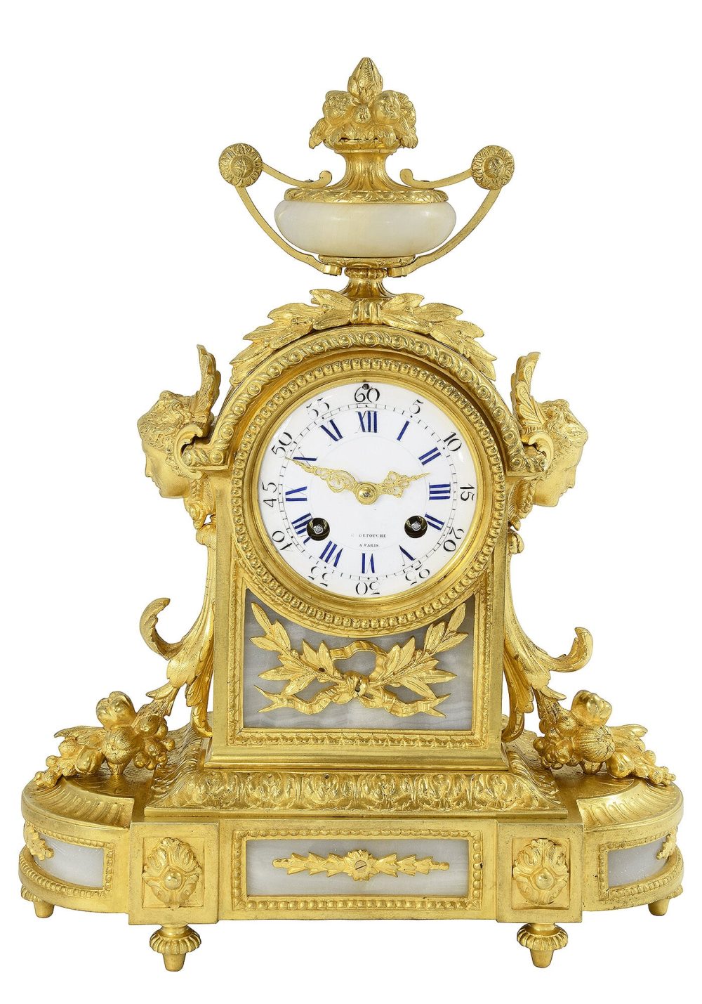 Haute manufacture, pendule d’époque Napoléon III estampillé sur le cadran et la platine du mécanisme C. Detouche, horloger référencé dans le Tardy, dictionnaire des horlogers Français. Architecture en bronze doré finement ornementé de masques féminin, grappes de fruits et végétaux, sur son ensemble est répartie de plaques en onyx créant un élégant mélange avec le bronze doré. Cadran bombé en émail blanc accompagné d’aiguilles dorées finement travaillées, protégé par un verre.
