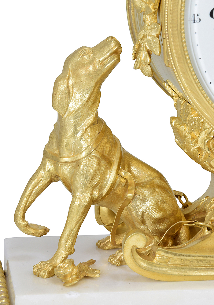 Modèle peu courant, d’époque Napoléon III de style Louis XVI. En bronze doré finement ciselé à décor d’un traineau tiré par un chien, au sommet d’un angelot triomphant d’un flambeau et d’un second angelot aux commandes.