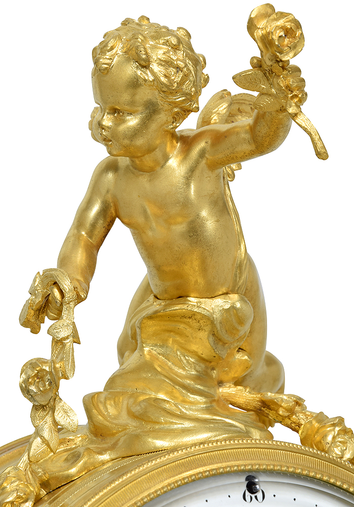 Large cadran bombé en émail blanc accompagné de fines aiguilles dorées. Base rectangulaire architecturée d’un bas-relief ciselé d’une scène d’angelots et de feuilles d’acanthe. Repose sur six pieds toupie.