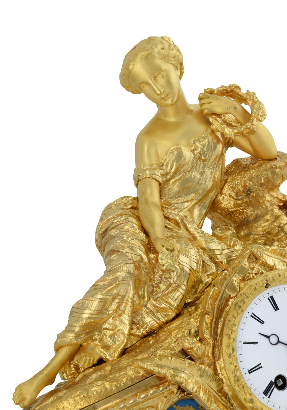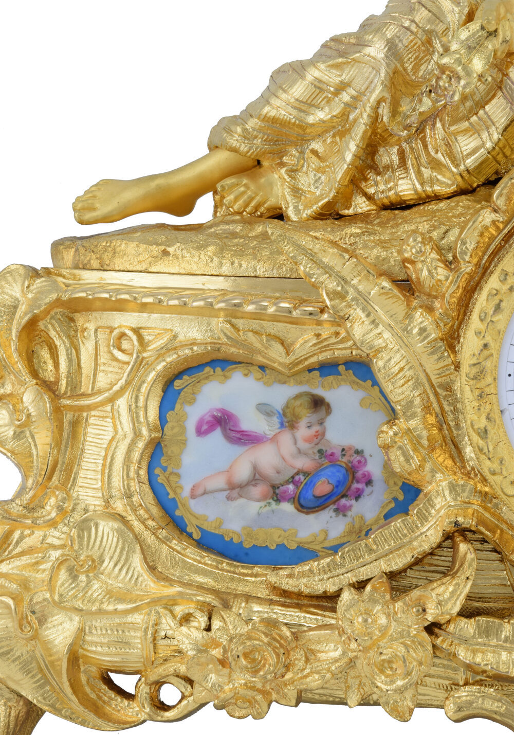Très belle pendule en bronze doré et ciselé à l’effigie de la déesse Flore, représentée par une large et grande sculpture allongée dans un environnement de nature avec ses attributs, coiffée d’une couronne de laurier et tenant dans chaque main des fleurs. La façade richement décorée de végétaux et de fleurs est ornée de deux plaques de porcelaine de Paris à décor d’angelots, chacun équipé d’un bouclier décoré d’un cœur ; elles encadrent le cadran en émail blanc. Époque Napoléon III.