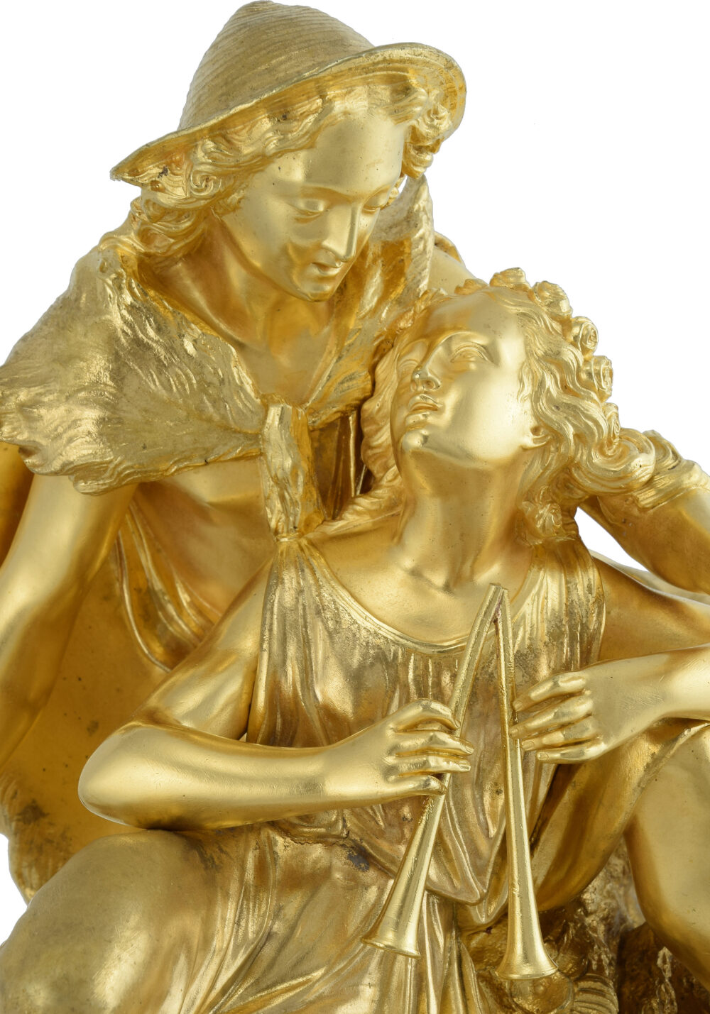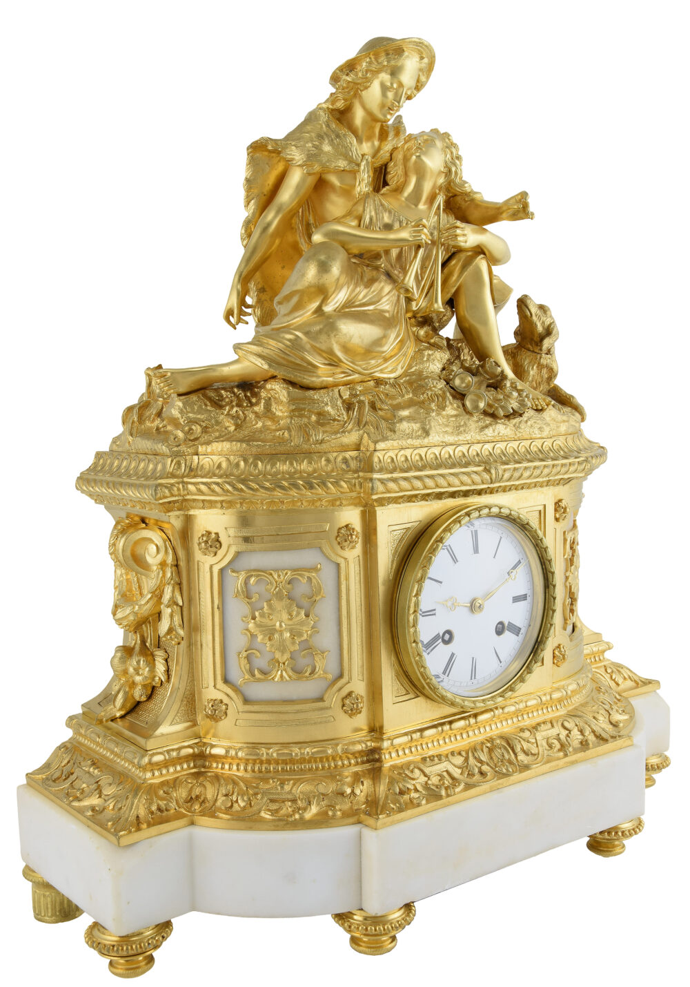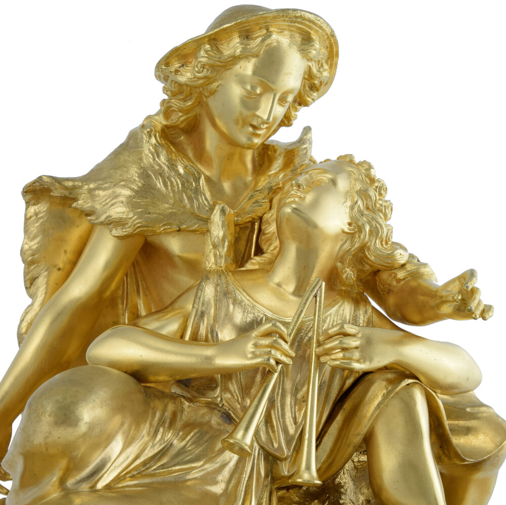 Grande pendule d’époque Louis-Philippe vers 1850. Bronze doré au mercure à l’or, importante scène romantique richement détaillée à figure de Pâris le berger enlaçant une jeune femme jouant du aulos. Large base richement ciselé dont la façade est décorée de plaques en marbre qui encadrent le cadran en émail blanc protégé par un verre. Seconde base en marbre accompagnée de six pieds ciselés.