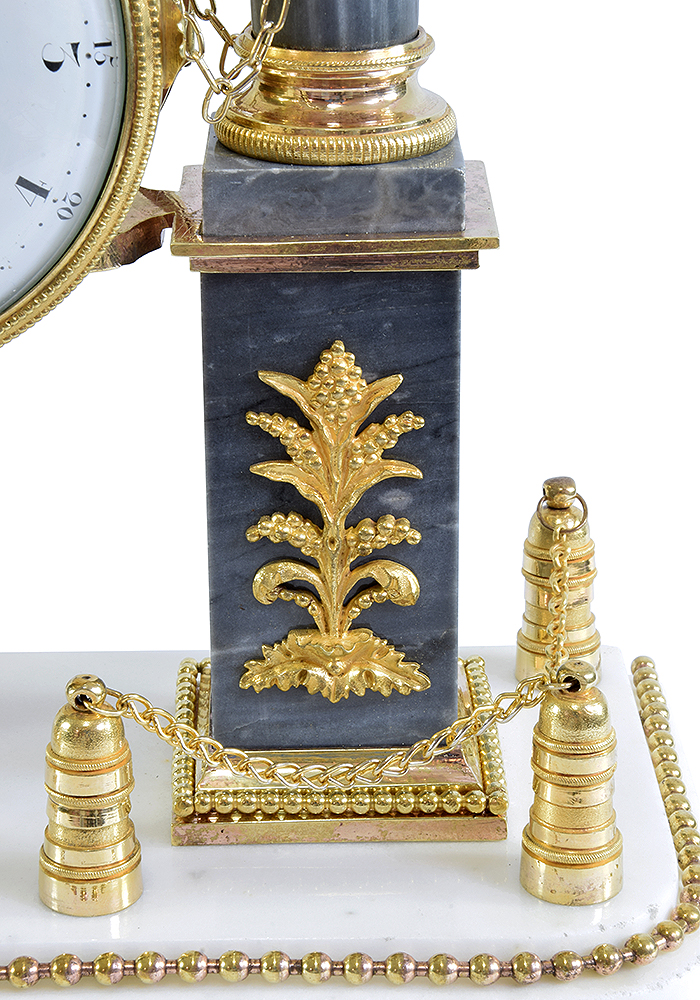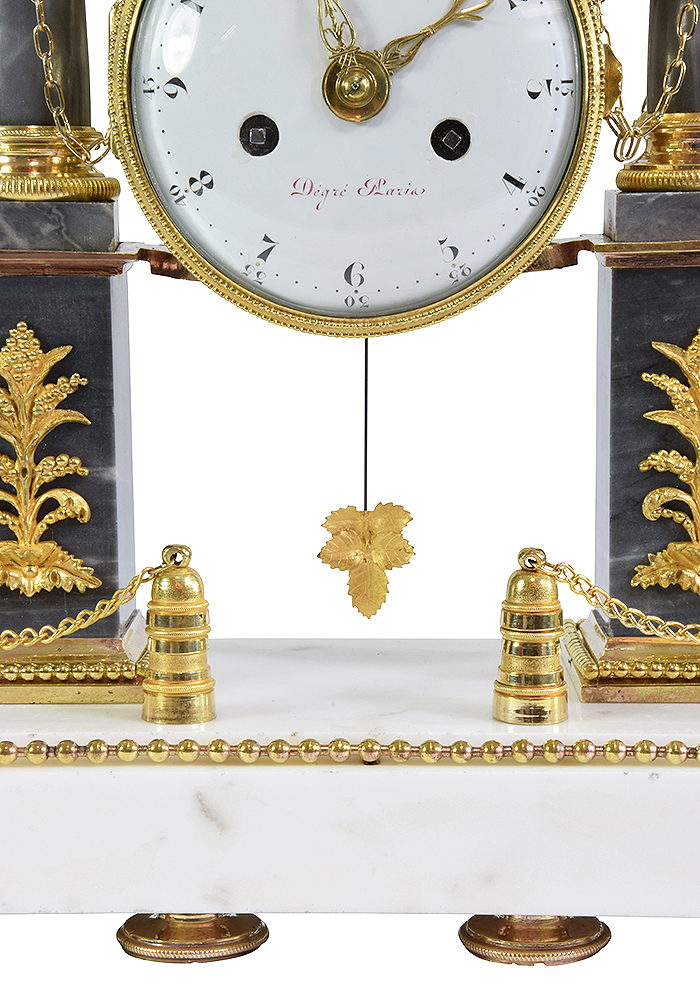 Rare pendule d’époque Louis XVI XVIIIème, signé Dégrès à Paris, horloger répertorié dans le Tardy, dictionnaire des horlogers français. Architecture en marbre blanc et marbre gris turquin à deux colonnes soutenu par un piédestal décoré de végétaux. Chainette accrochées des colonnes au cylindre du mouvement donnant l’illusion de le porter.