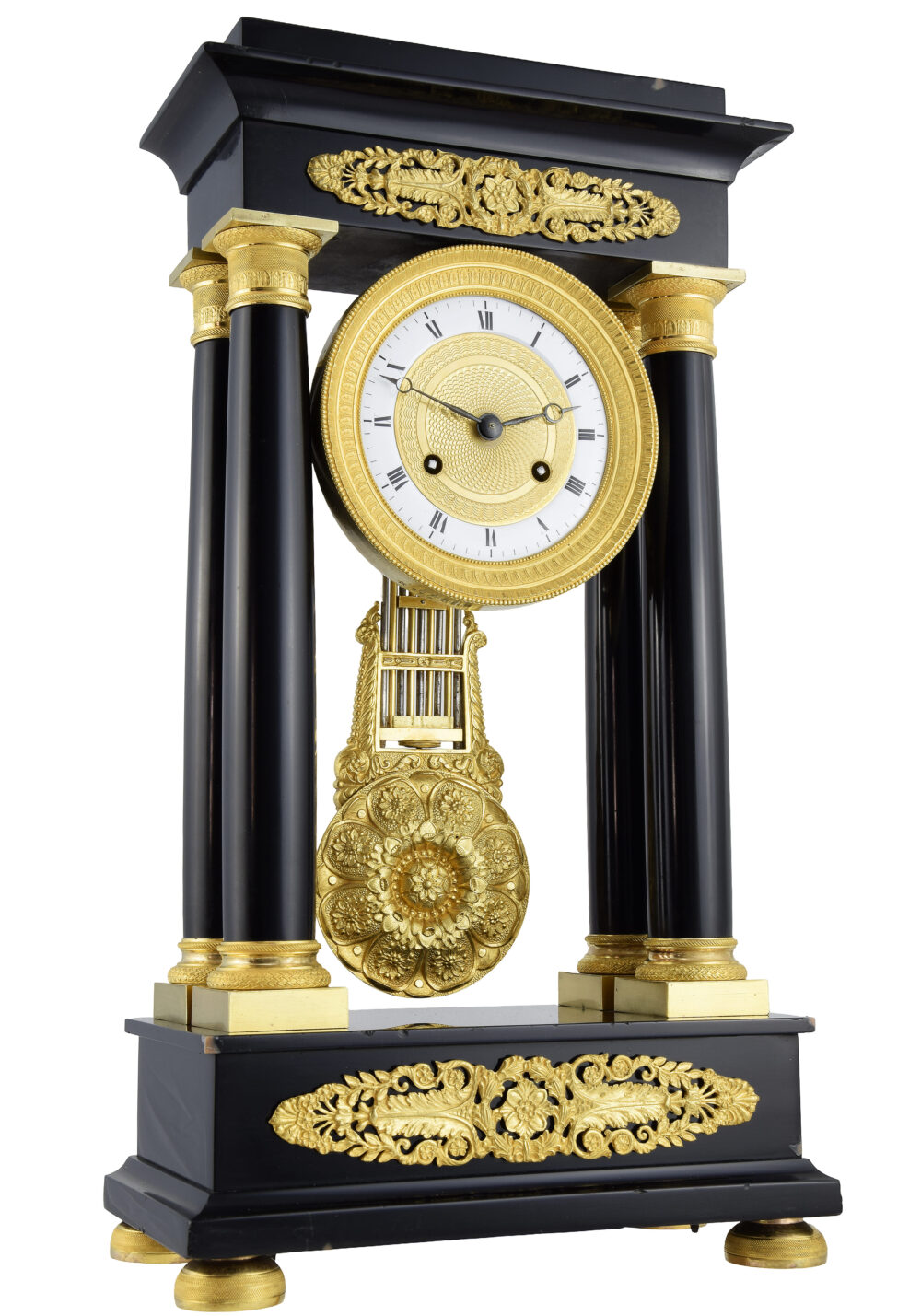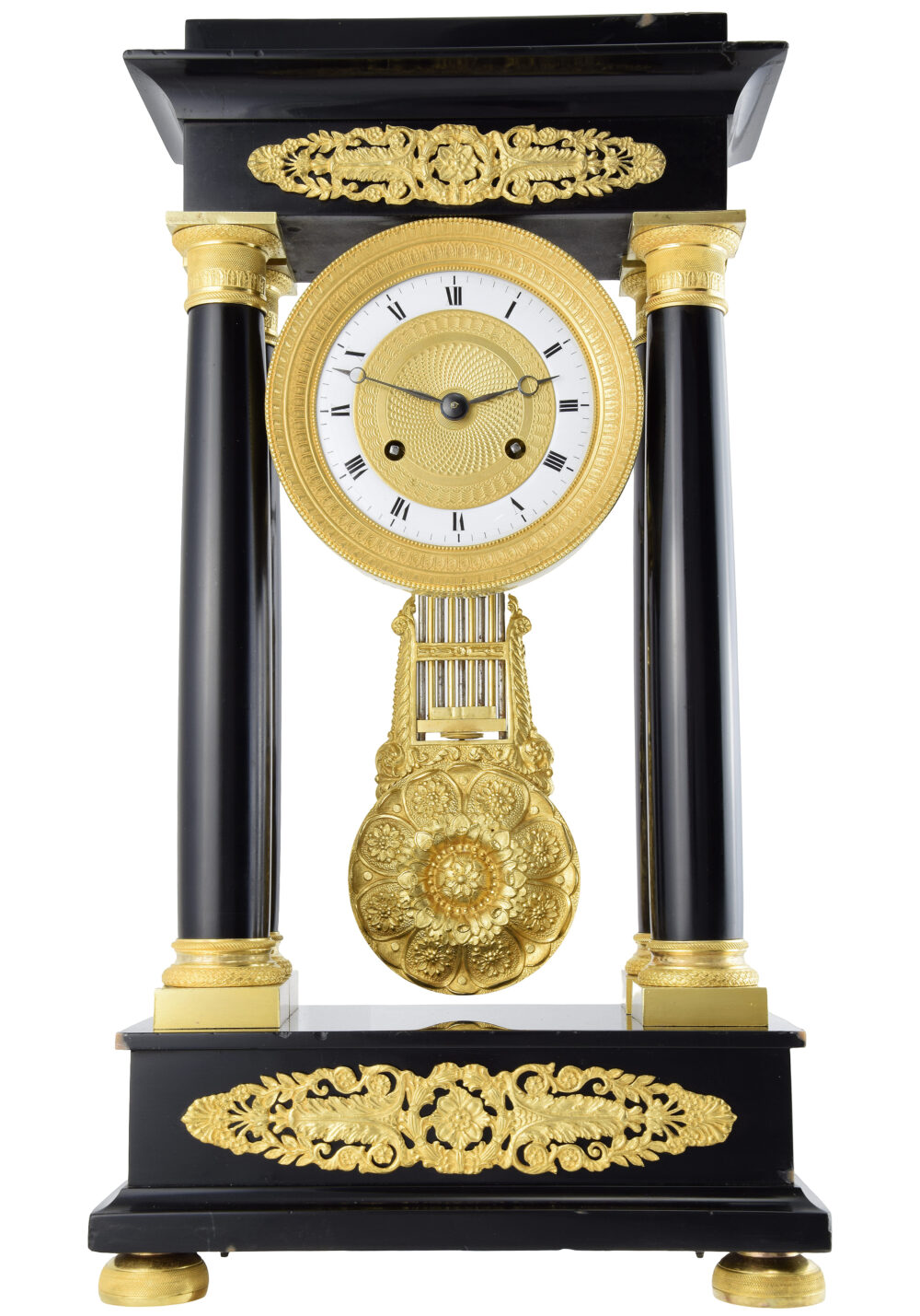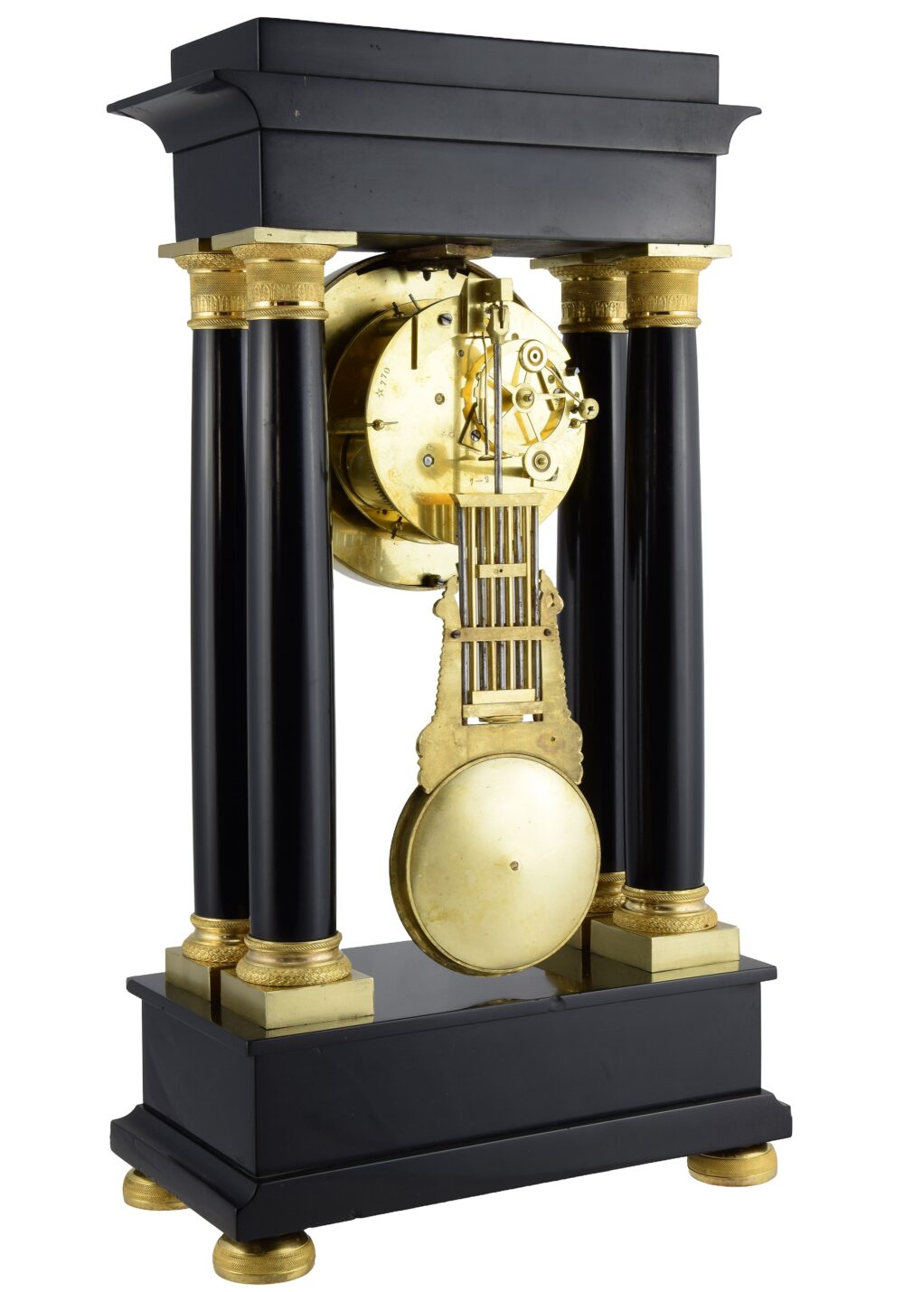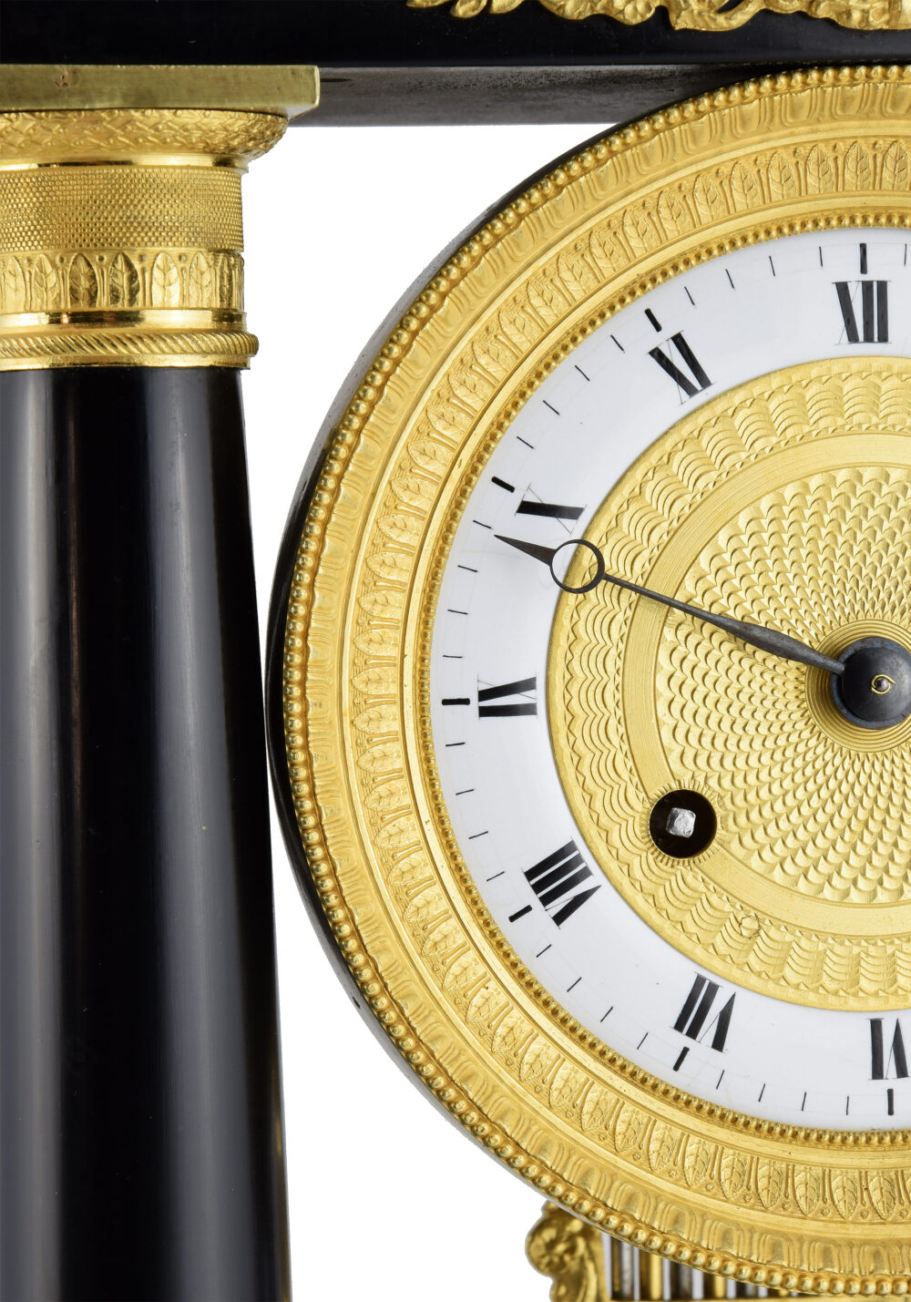 A superb Charles X period portico clock, circa 1840, remarkable for its refined combination of mercury-gilt bronze and fine gold, and an exceptionally high-quality black marble with a deeply luminous and meticulously polished surface.