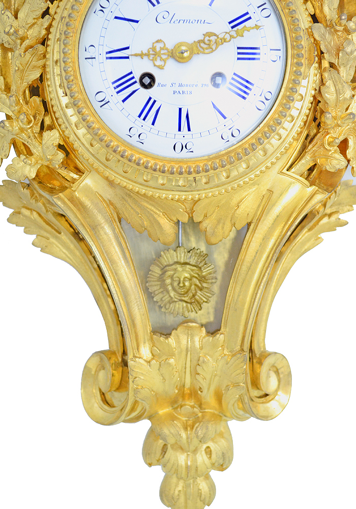 Sublime cartel d’applique tout en bronze doré finement ciselé d’enroulements, branches et feuillages mouvementés dans le style Louis XV.Le cadran en émail blanc souligné sur les côtés de branches, chiffres romains de couleur bleue accompagné d’aiguilles dorées finement travaillées, cadran protégé par une porte à clapet serti d’un verre bombé et d’un entourage de rang de perles en bronze.