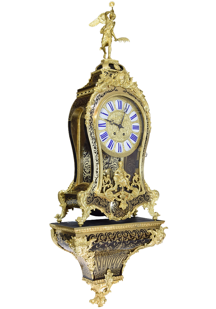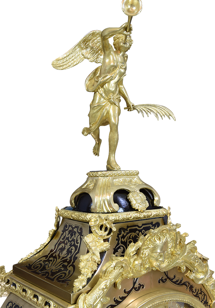 Magnifique cartel d’applique de style Louis XV d’époque Napoléon III. Sublime marqueterie technique Boulle en écaille de tortue et de laiton doré, ornementation en bronze doré finement ciselé à décor de masques feminins, de la Muse Uranie en façade, de feuillage mouvementé, d’arc et carquois et au sommet une sculpture de la déesse Romaine Fama.