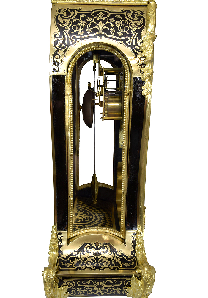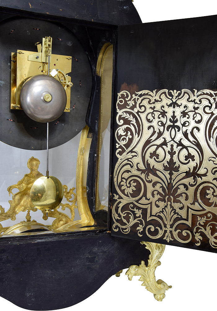 Ouverture de la porte vitrée par une serrure à clé, intérieur lumineux, également recouvert de marqueterie technique Boulle dont l’espace est occupé par un balancier lentille doré.