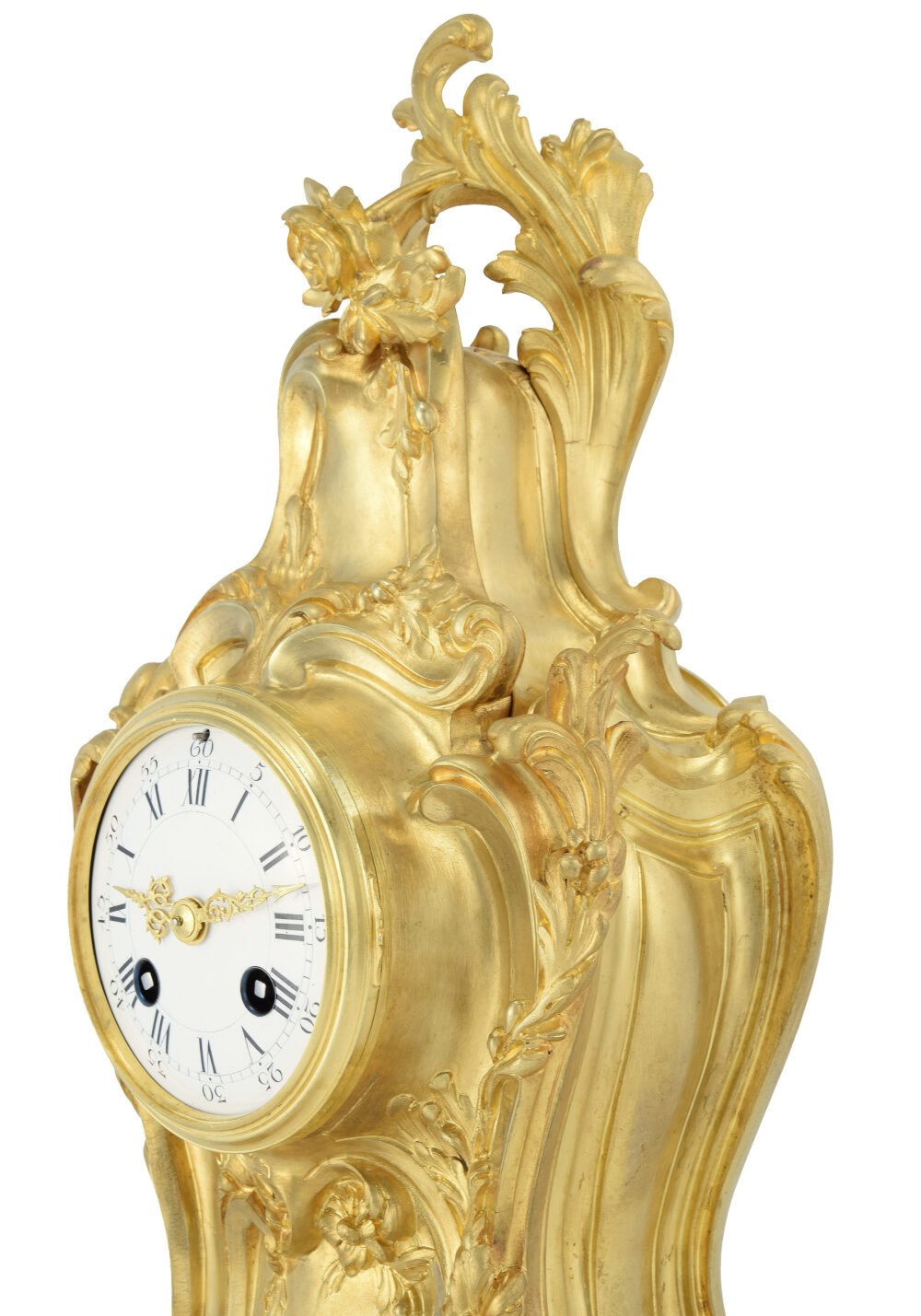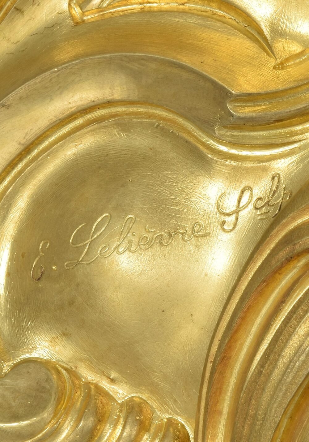 Pendule dans le style Louis XV d’époque fin XIXème début XXème, ensemble de très haute qualité, estampillé du sculpteur Eugène Lelièvre (1856-1945) et du fondeur parisien également très célèbre « Susse frères ». En bronze doré, belle sobriété, finement ciselé à décor de feuillages en volutes et de motifs floraux. Cadran bombé en émail blanc accompagné de fines aiguilles dorées, ensemble protégé par un verre bombé.