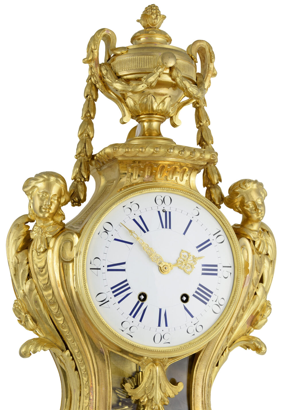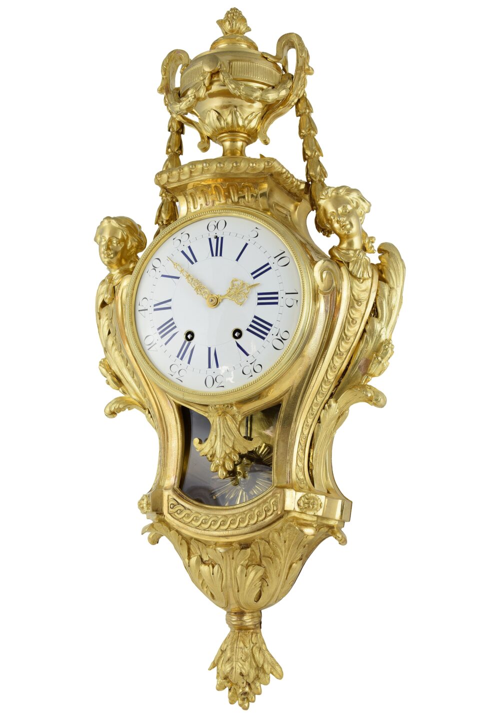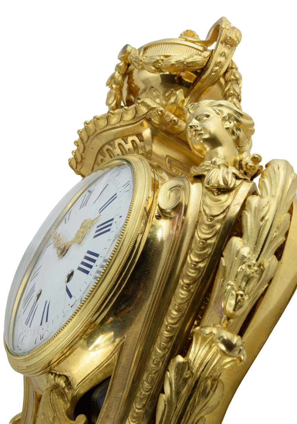 Le cadran est encadré par deux bustes féminins en gaine, soulignés de rinceaux. Ces figures, tournées l’une vers l’autre, renvoient aux motifs dits « en espagnolette ». La partie centrale est animée par un très beau balancier d’origine, à visage rayonnant en haut-relief, visible à travers une partie vitrée dont le verre épouse la courbe galbée de l’architecture. Contrairement à ce que laisse paraître la photographie, celui-ci se distingue parfaitement et présente la même dorure que le cartel.