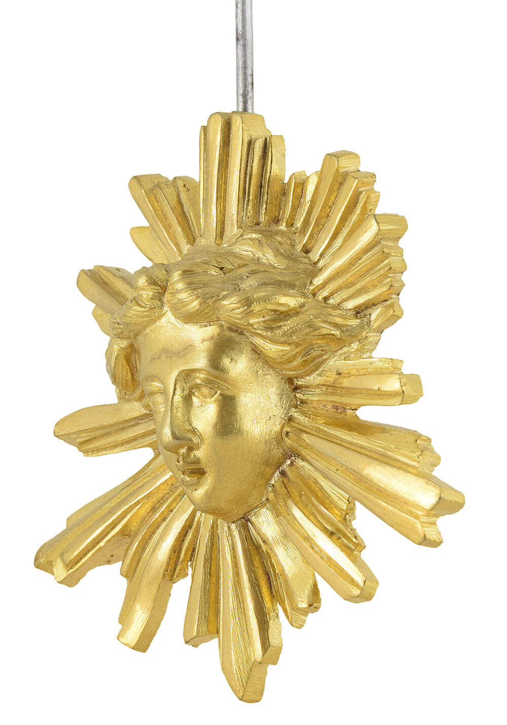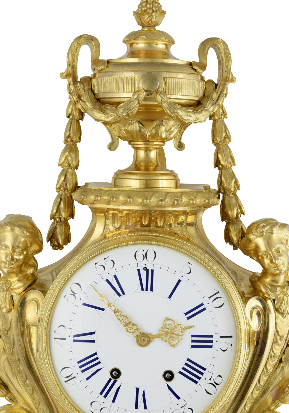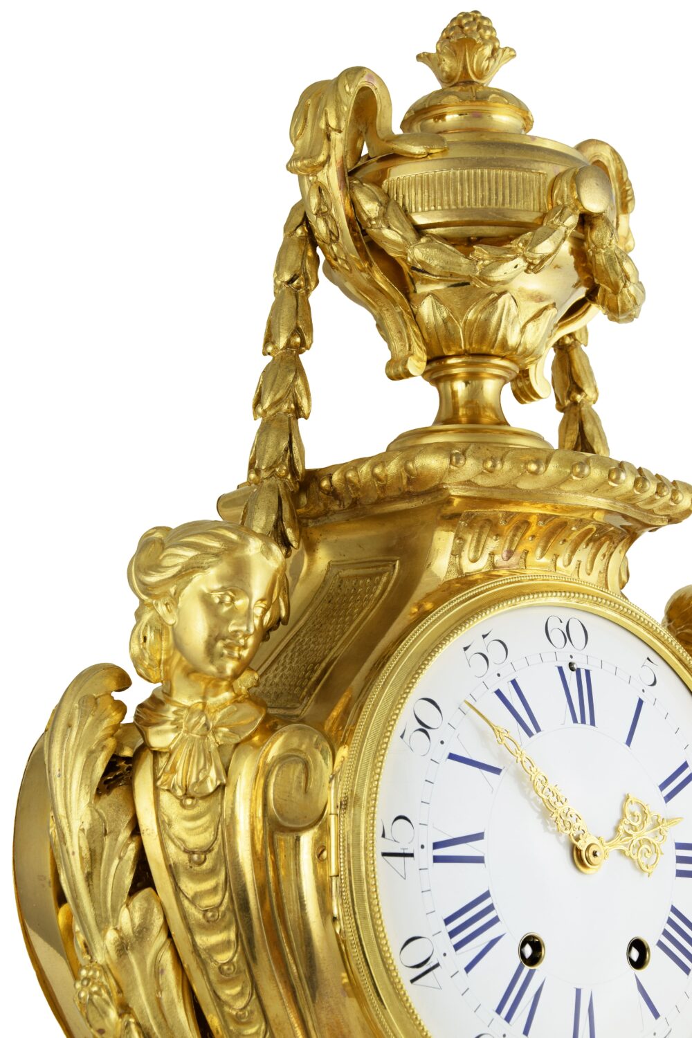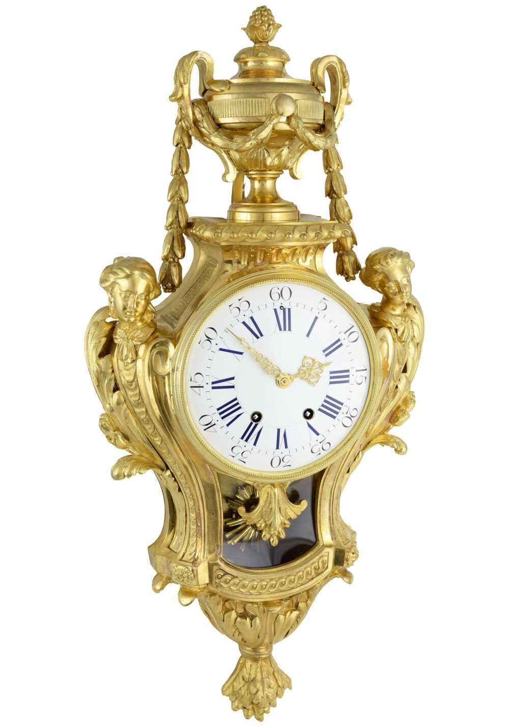 Le cadran est encadré par deux bustes féminins en gaine, soulignés de rinceaux. Ces figures, tournées l’une vers l’autre, renvoient aux motifs dits « en espagnolette ». La partie centrale est animée par un très beau balancier d’origine, à visage rayonnant en haut-relief, visible à travers une partie vitrée dont le verre épouse la courbe galbée de l’architecture. Contrairement à ce que laisse paraître la photographie, celui-ci se distingue parfaitement et présente la même dorure que le cartel.
