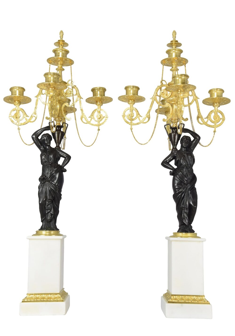 Très belle paire de candélabres d’époque Napoléon III vers 1860. Ensemble de très belle qualité constitué d’une sculpture en bronze patiné à décor d’une vestale soutenant, à l’aide d’une épaule, un vase à l’antique prolongé par le large chandelier. En bronze doré, imposant chandelier à cinq feux de lumière, chaque branche est ornementée par une chaînette doublée. Les coupelles sont décorées de gravure sur le dessus et en dessous de motifs ciselés. Chaque porte-bougie est équipée de protection de cire d’origine et amovible, et d’un étouffoir au sommet. Base massive carrée en marbre de carrare soulignée par un contour ficelle en bronze.