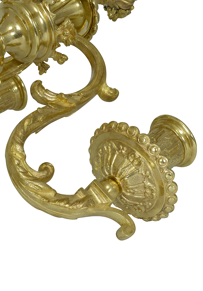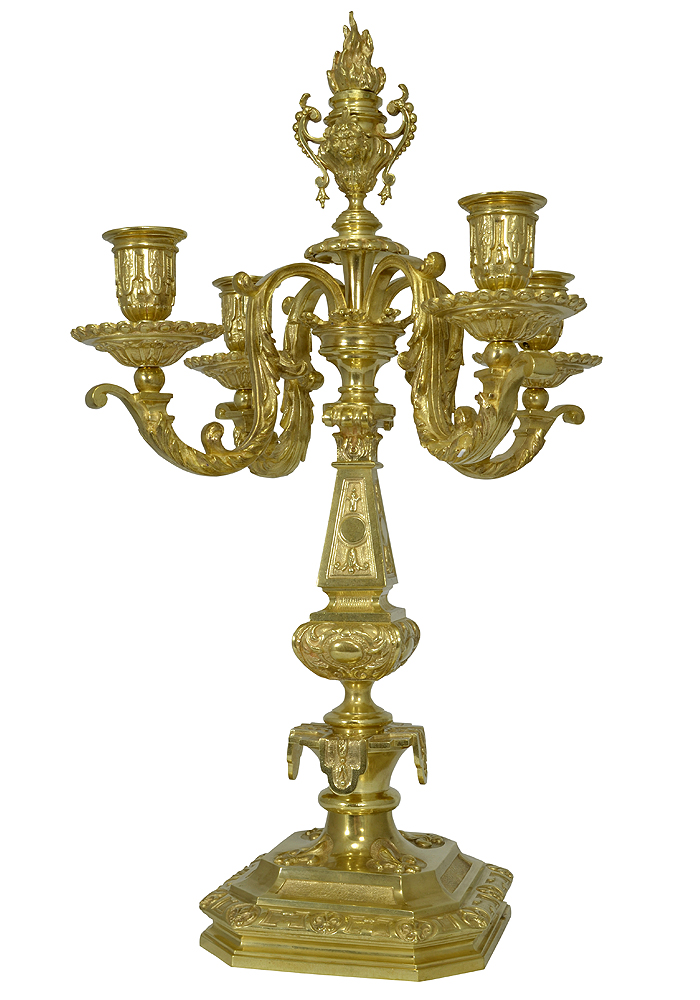 Chandelier / centre de table en bronze doré richement ciselé dans un décor de feuillages, têtes de lion et de nombreuses fleurs de lys. Quatre bras de lumière, chaque binet est équipé de leur bobèche d’origine et amovible, orné au sommet d’un vase en flamme. Epoque Napoléon III.