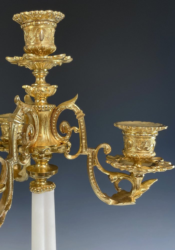 Très décoratif et harmonieuse paire de chandeliers en bronze doré finement architecturé. Fût central en marbre blanc de carrare, chandeliers à quatre feux de lumière chacun équipés de leur protection de bougies amovibles et d’origine. Piètement tripode ciselé de feuilles de vigne et d’une base en marbre. Epoque Napoléon III