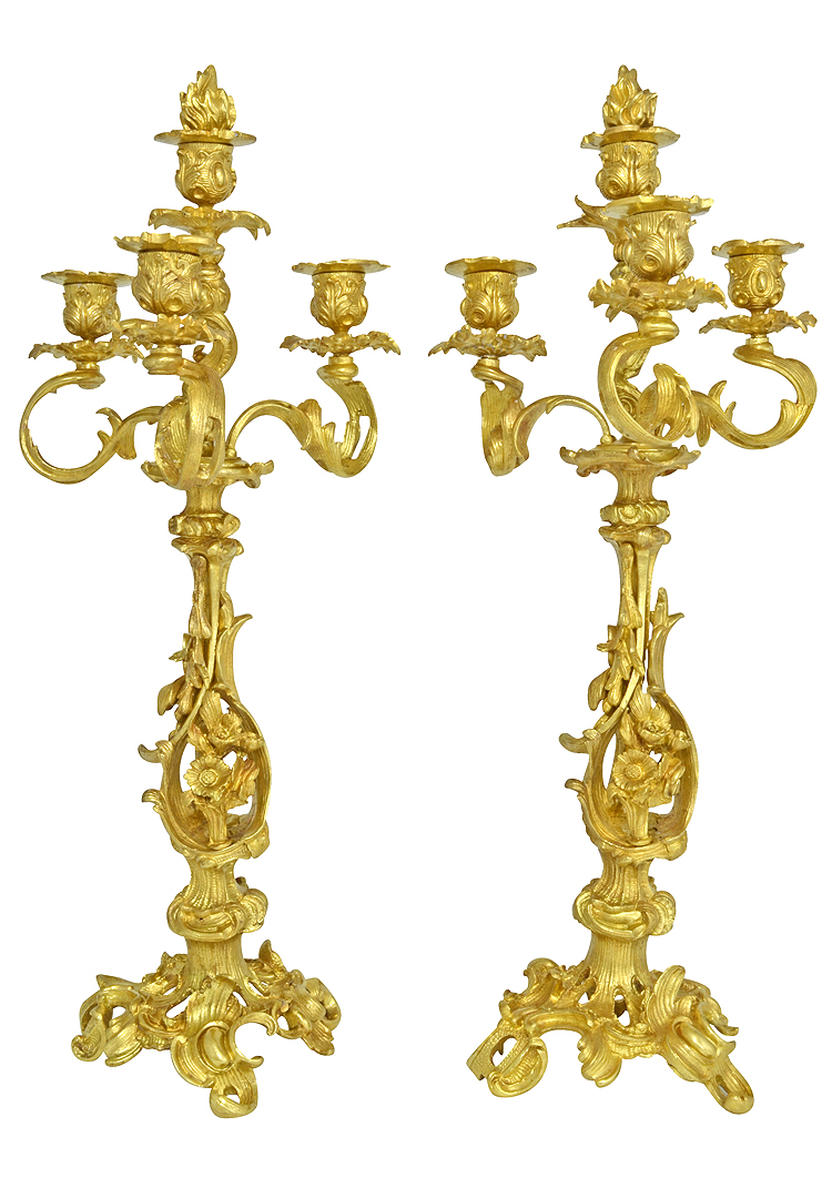 Très belle paire de chandeliers en bronzes doré richement sculptés et ouvragés aux formes mouvementées. D’époque Napoléon III de style Louis XV. Ils sont équipés de leurs bobèches d’origine et de leurs étouffoirs à décor d’une flamme.