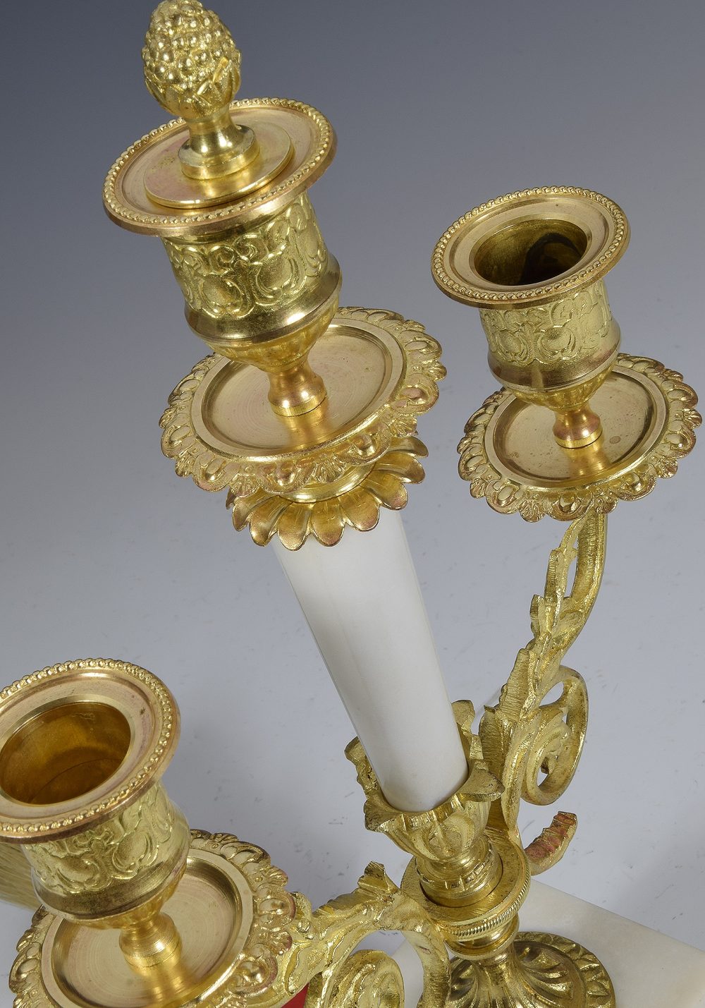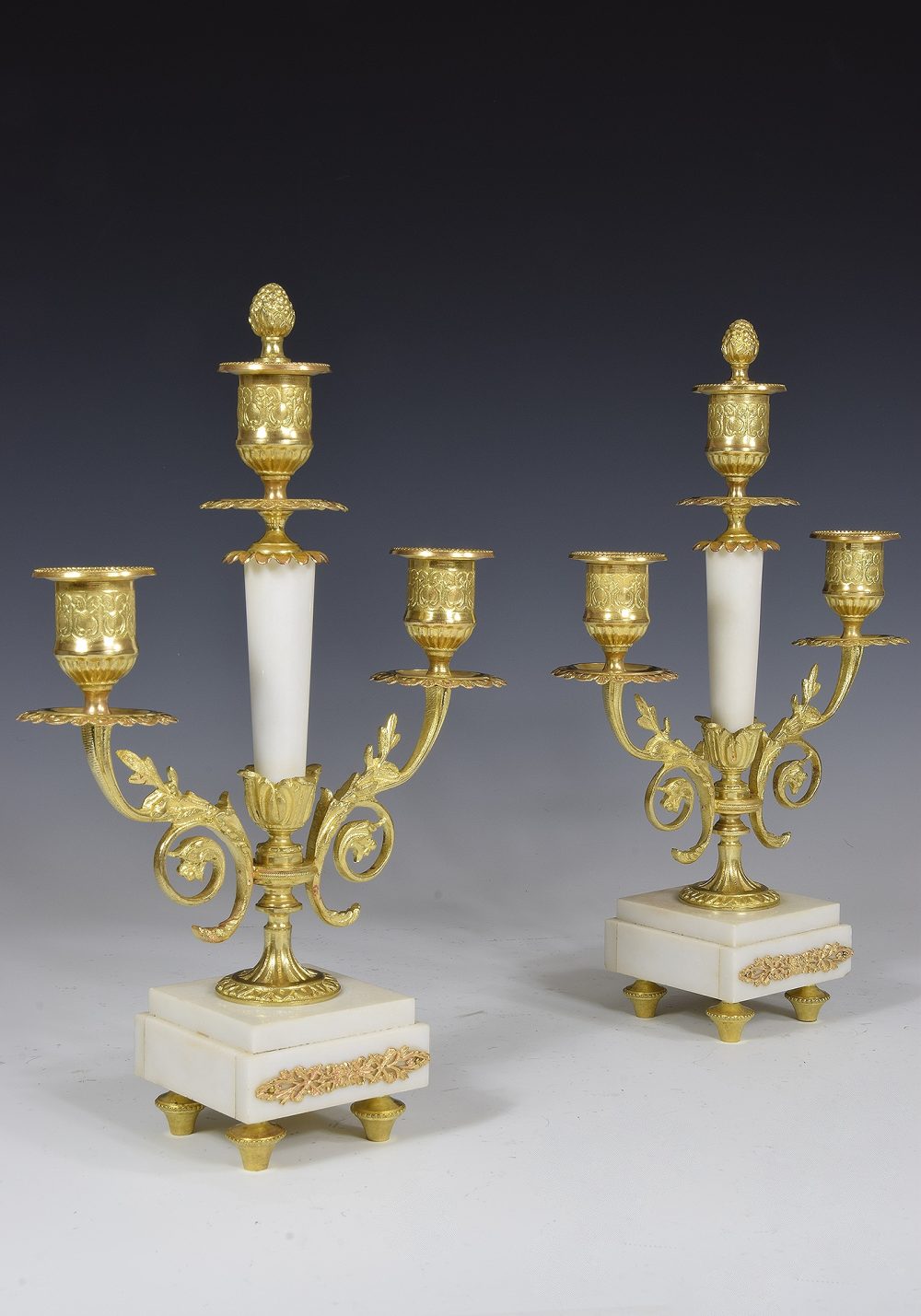 Paire de chandeliers dans le style Louis XVI et d’époque Napoléon III. Ensemble de qualité en bronze doré et marbre de carrare. Chaque porte-bougie est équipée d’une protection de cire d’origine et amovible.
