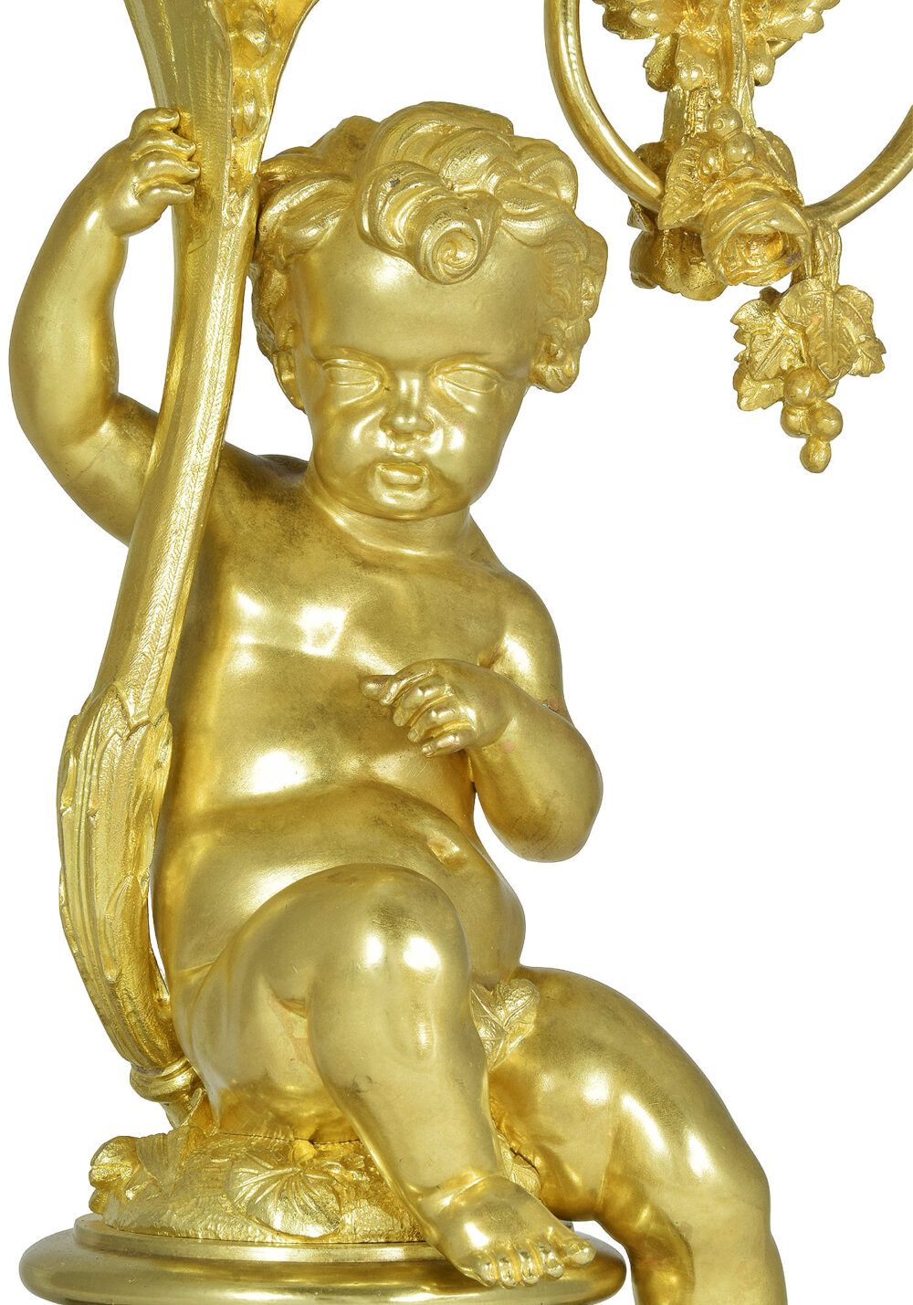 72 cm, très grand candélabre très décoratif d’époque Napoléon III vers 1860. En bronze doré finement ciselé, à décor d’un imposant et magnifique chérubin assis, agrippant un tronc d’où s’échappent une multitude de branches formant un splendide chandelier. Chandeliers composés de sept feux de lumières, chaque porte-bougie est équipé d’une protection de cire et d’une flamme au sommet en guise d’étouffoir. Base très architecturale en marbre massif noir ornementé de feuilles et d’un contre-socle en bronze accueillant quatre pieds.