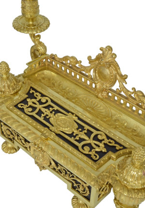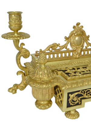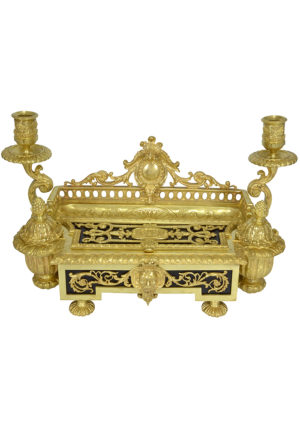 Rare et imposant encrier dans le style Régence d’époque Napoléon III. En plus de sa fonction initiale, dans le prolongement des pieds griffes, se terminent en bougeoir et au centre d’un large compartiment.