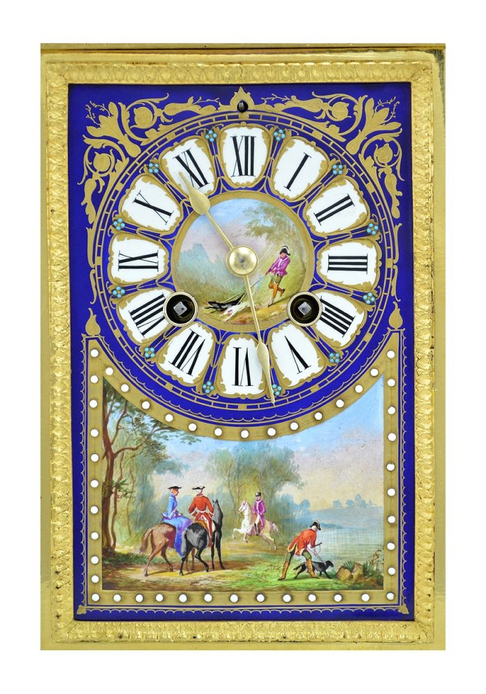 Rare pendule de forme borne, fine architecture en bronze doré ciselé de feuille d’eau encadrant trois plaques en porcelaine peinte de scènes de chasse souligné par un relief de demi-sphère blanche et verte sur fond de gros bleu rehaussé de motifs de couleur or. A noter la grande technicité due travaille de peinture, d’encadrement de chaque chiffre et d’une illustration au centre.
