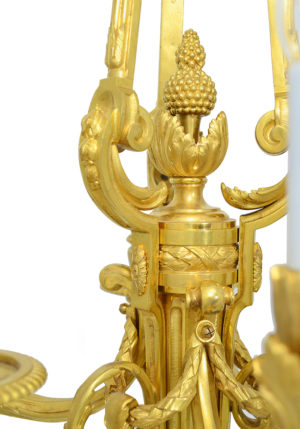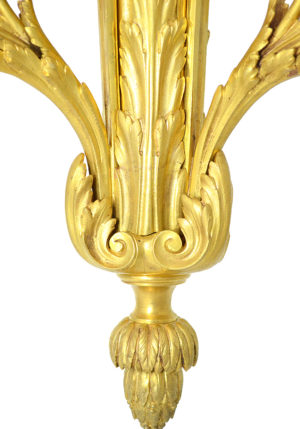 Splendide lustre modèle très épuré dans un esprit Louis XVI en bronze doré d’époque Napoléon III. Architecture complexe doté de grand bras de lumières décorés de feuillages et d’enroulements. Bronze très épais, ciselures de grande qualité finement exécutées, dorure en excellant état de conservation d’une parfaite homogénéité. Compte six bras de lumières, électrification aux normes, cache bougie en opaline.