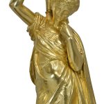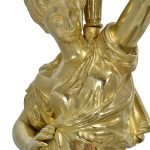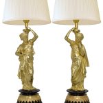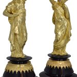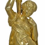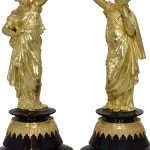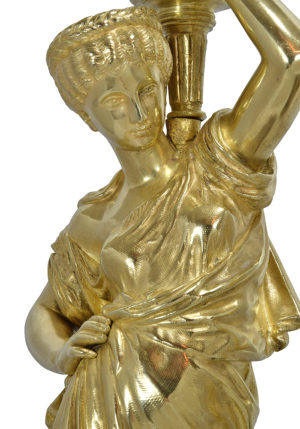 Paire de lampes aux vestales drapée à l’antique de très belle qualité en bronze doré. Base cylindrique composée de marbre noir et d’une ornementation ciselée en bronze doré, l’ensemble repose sur des pieds griffés.