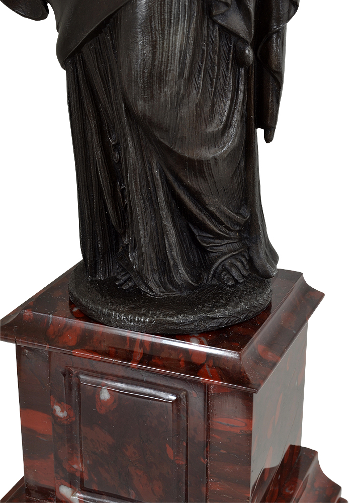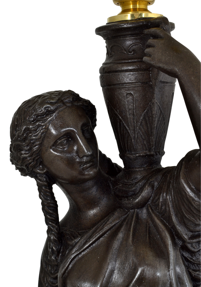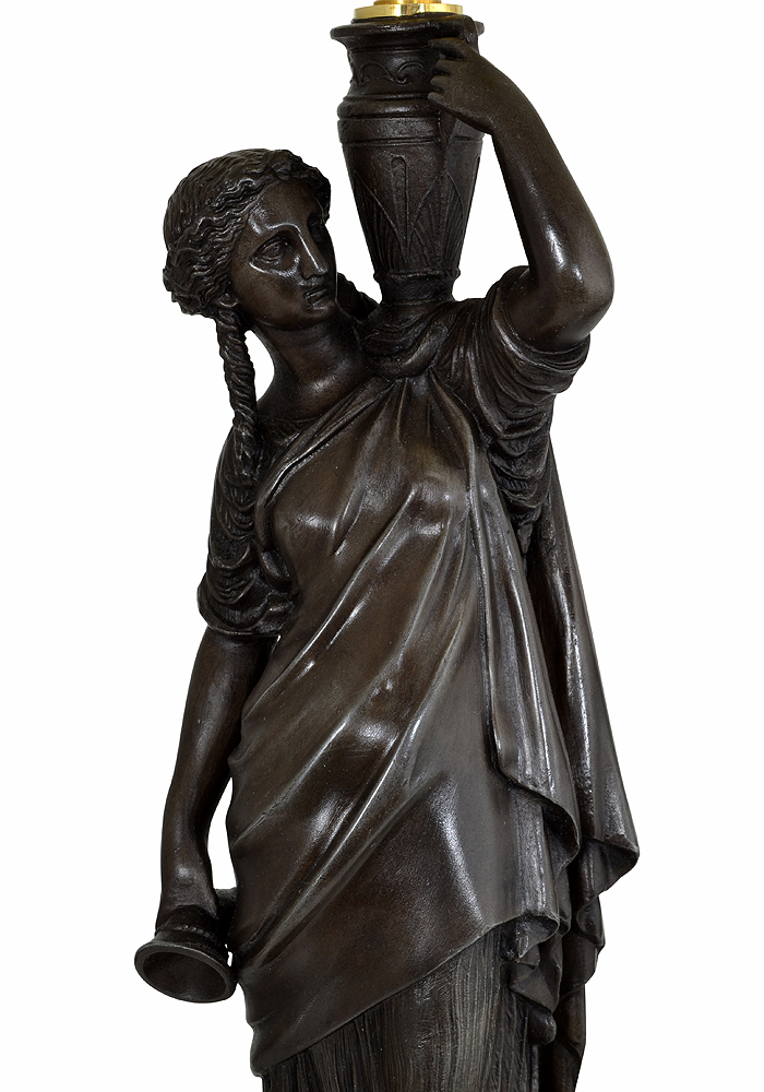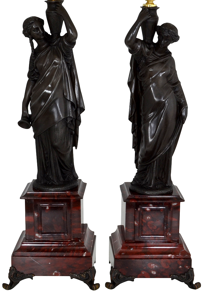 Très belle paire de lampes aux vestales en métal patiné portant une jarre, elles reposent chacune sur une base en marbre rouge griotte doté dans piétement feuillagé patiné. Epoque Napoléon III.