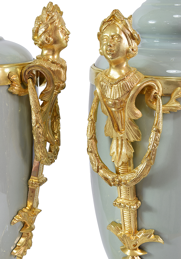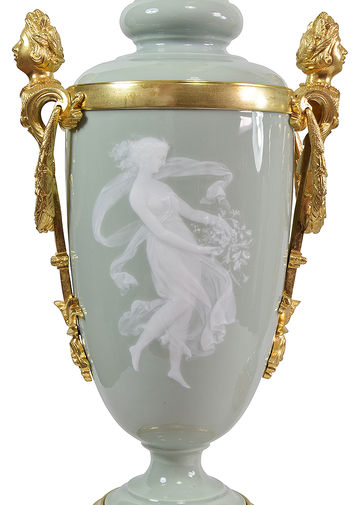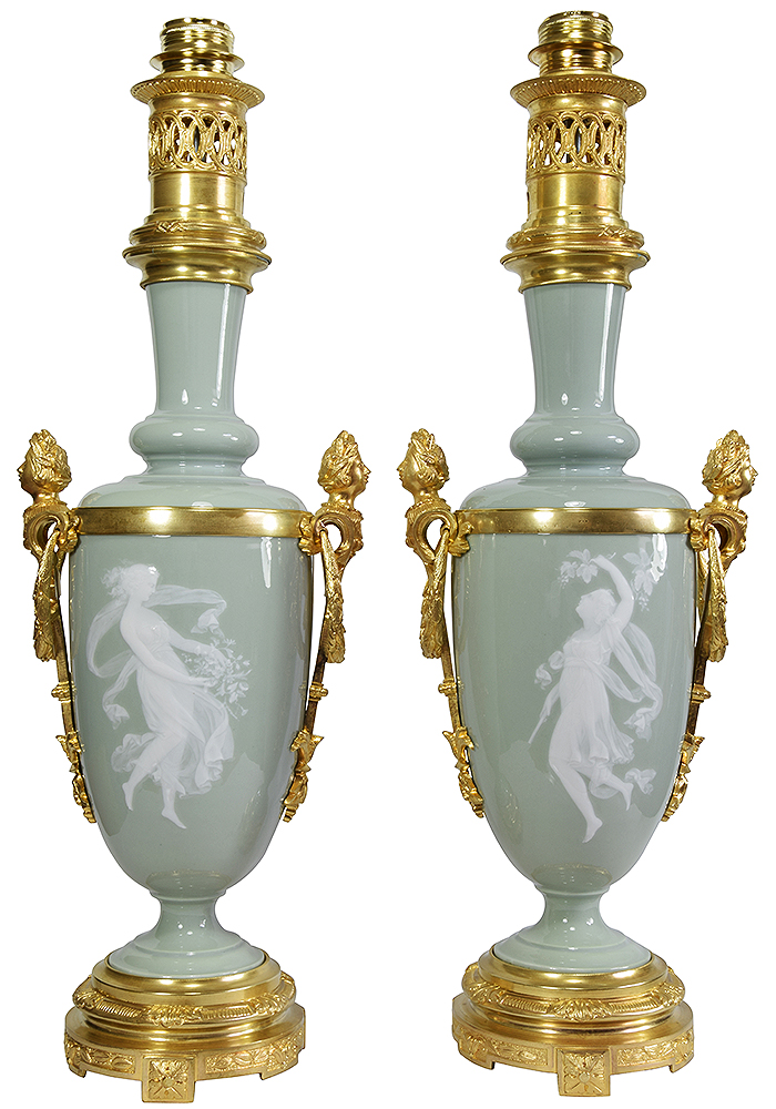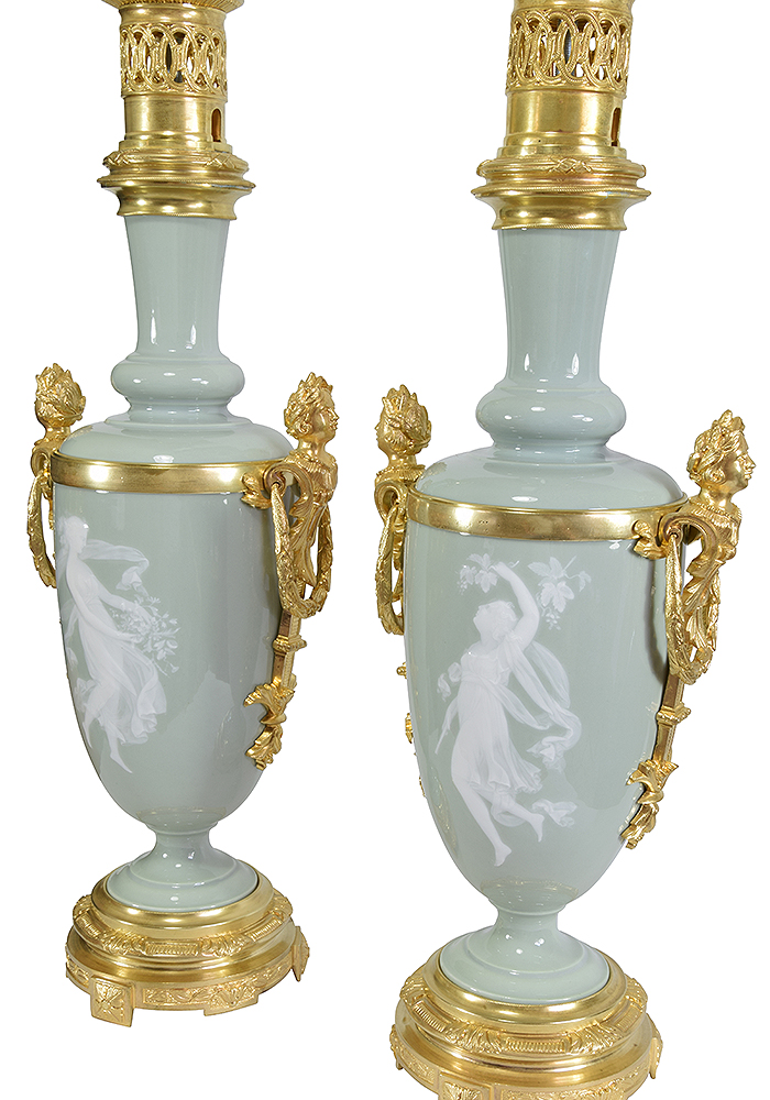 Paire de lampes très décoratives, d’un aspect très lumineux, constituées de porcelaines céladon décorées en relief de femmes à l’antique et de motifs végétaux sur les faces arrière. Monture ciselée en bronze doré, anses à tête de Cérès, déesse de l’agriculture. Epoque Napoléon III. Parfait état.
