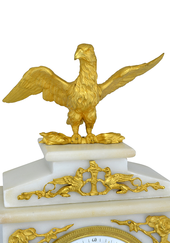 La partie haute comporte « la pendule » repose sur la cheminée, le cadran en émail blanc est inscrit dans une borne en marbre flanqué de quatre roses et surmonté d’une frise aux sphinx et d’un magnifique aigle aux ailes déployées. Les aiguilles en bronze doré se terminent par une fleur de lys.