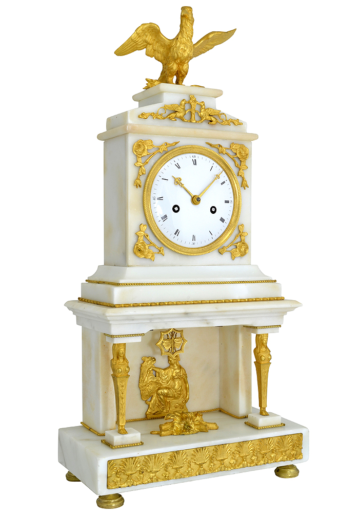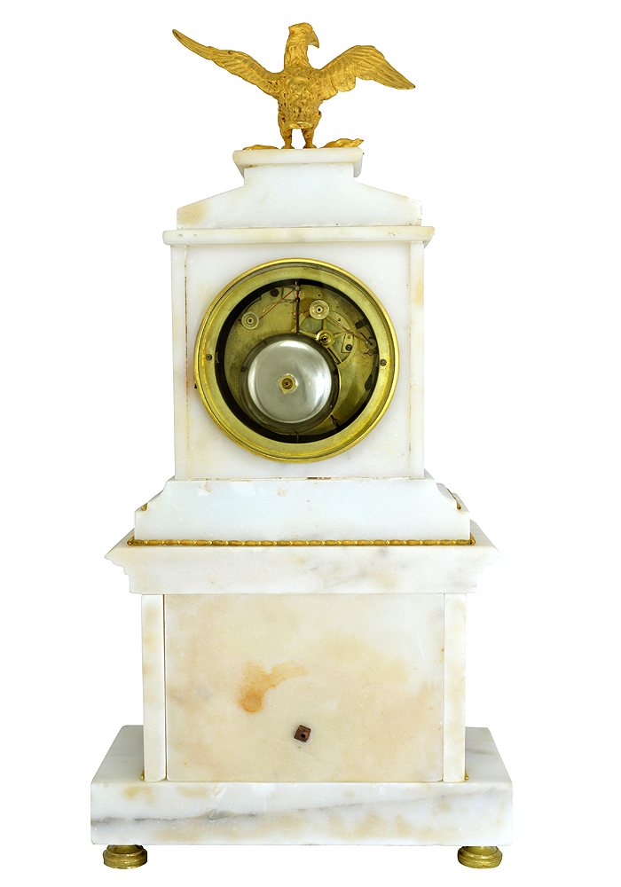 Rare et grande pendule d’époque Consulat (1799-1805) en marbre blanc et bronze doré au mercure.