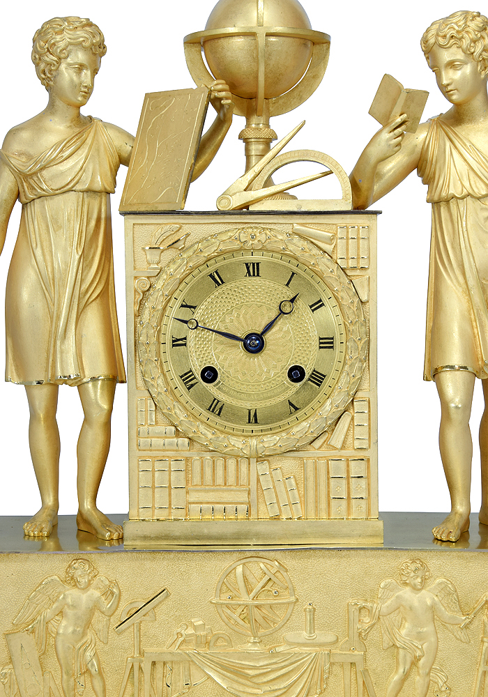 Pendule en bronze doré au mercure d’époque Restauration vers 1820, signé « Coudelou à la Rochelle » horloger référencé dans le Tardy, dictionnaire des horlogers français. Sur le thème des arts et des sciences à décor de deux jeunes étudiants drapées à l’antique encadrant une bibliothèque où est inscrit le cadran surmonté d’un globe terrestre et d’instruments mathématiques. Base rectangulaire ciselé d’une illustration du thème principal en bas-relief.