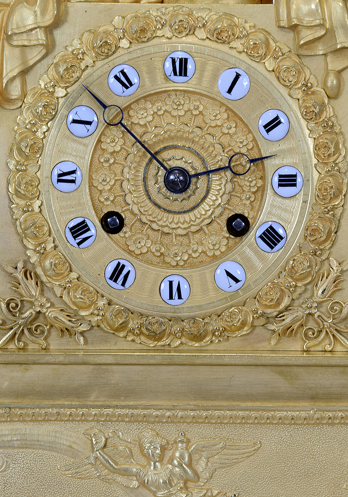 Cadran en bronze doré ciselé de fleurs serti de douze cartouches émaillées, sur la base repose une aiguière finement travaillée à col-de-cygne et ciselé de scènes d’angelots.