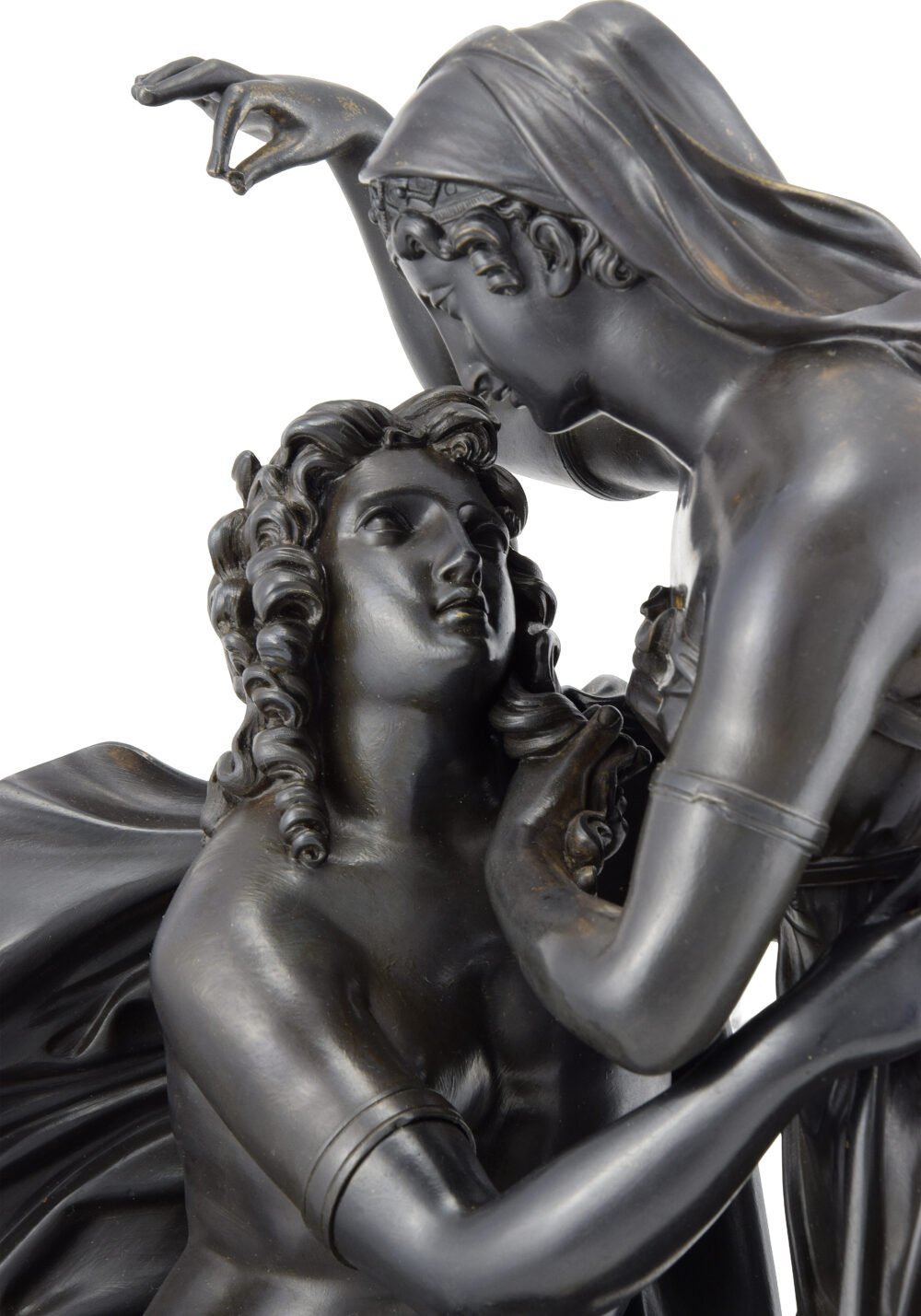 La dynamique des postures crée un dialogue visuel intense : Héro se penche vers Léandre dans un mouvement protecteur et tendre, tandis que celui-ci l’enlace légèrement, accentuant la dimension sentimentale de la scène. Les visages, finement modelés, expriment une émotion retenue et élégante, caractéristique de la sensibilité néoclassique où l’équilibre et la noblesse du geste priment sur l’exubérance. Le contraste entre le bronze patiné sombre des figures et l’éclat lumineux du bronze doré de la base met en valeur la richesse décorative de l’objet et renforce la profondeur de la composition.