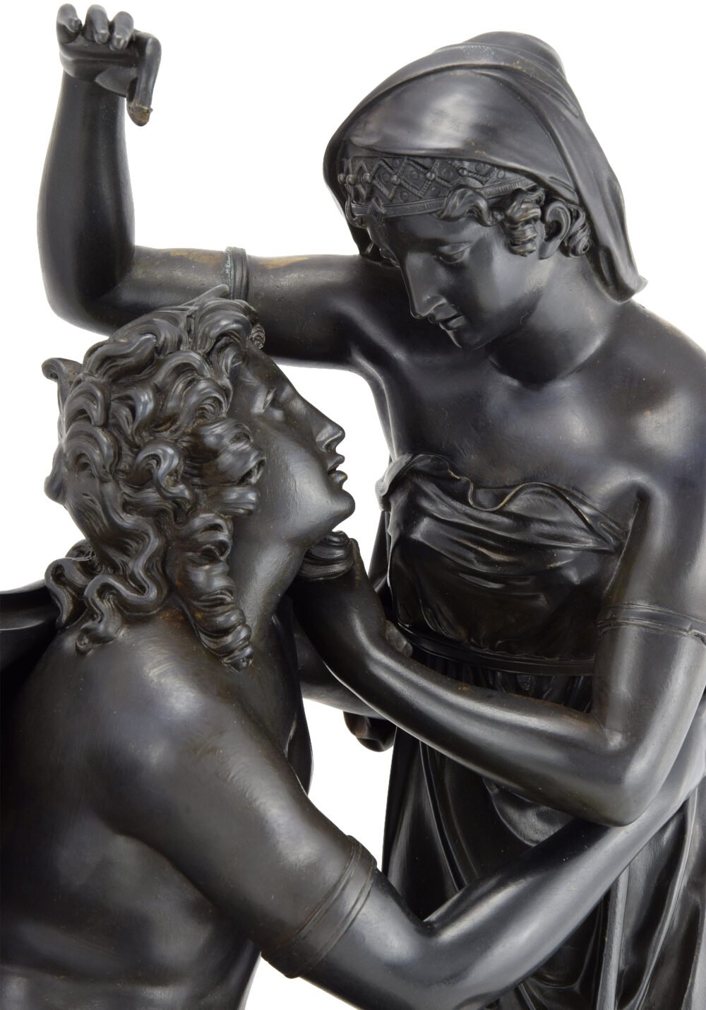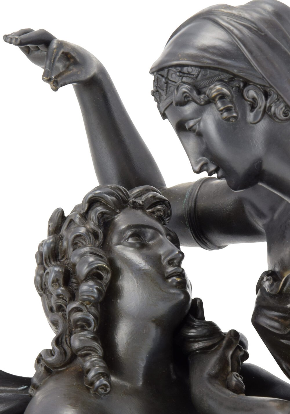 Au-dessus de cette base monumentale s’élève un groupe sculpté en bronze patiné, représentant une scène inspirée de la légende antique de Héro et Léandre. La figure féminine incarne Héro, prêtresse d’Aphrodite, reconnaissable à son port noble et à son voile délicatement posé sur la tête. Dans un geste plein de grâce, elle élève la main tenant une goutte, comme pour parfumer son amant Léandre, geste délicat qui traduit l’intimité et la tendresse de leur relation. Face à elle, Léandre est représenté assis, légèrement incliné vers la jeune femme, le regard levé vers elle avec une expression mêlant admiration et abandon. Son corps athlétique, partiellement drapé, rappelle l’idéal esthétique de l’Antiquité, tandis que le modelé souple des chairs et le traitement animé des draperies témoignent d’un remarquable travail de sculpture.