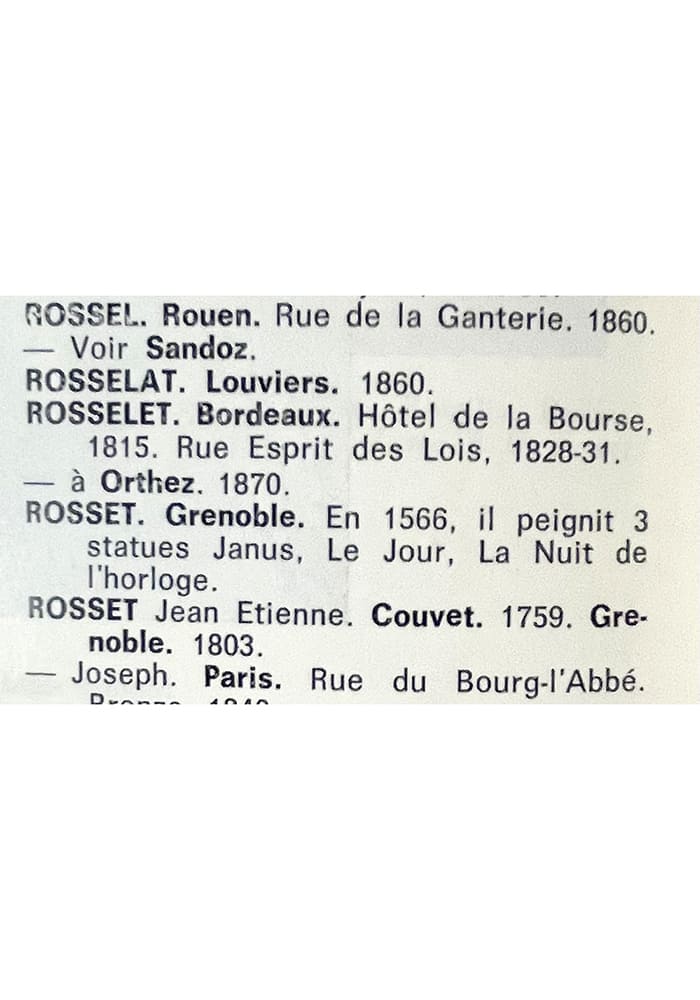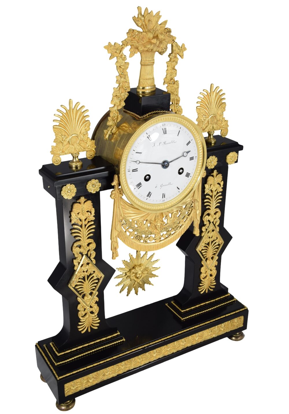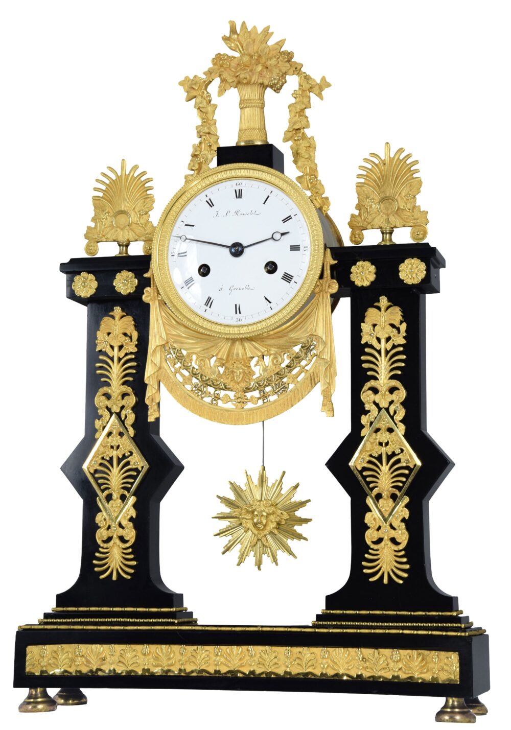 Pendule portique d’époque Empire, signé sur le cadran « Rosselet à Grenoble » référencé dans le Tardy à la date de 1815. Ornementation en bronze doré au mercure à l’or. Micro-temple du temps, architecture en marbre noir à deux piliers symboliques élancées de forme géométrique octogonales et losangées, elle sont orné d’une décor de palmettes et de losanges. Elles supporte la partie haute décoré de rocases ornement antique, symbole de beauté harmonieuse, encadrant le large cadran bombé en émail blanc souligné par un contour ciselé de feuille d’eau. Surmonté d’une corbeilles de fleurs et fruits, motif d’abondance et de prospérité puis souligné par des guirlandes végétales tombant de part et d’autre.