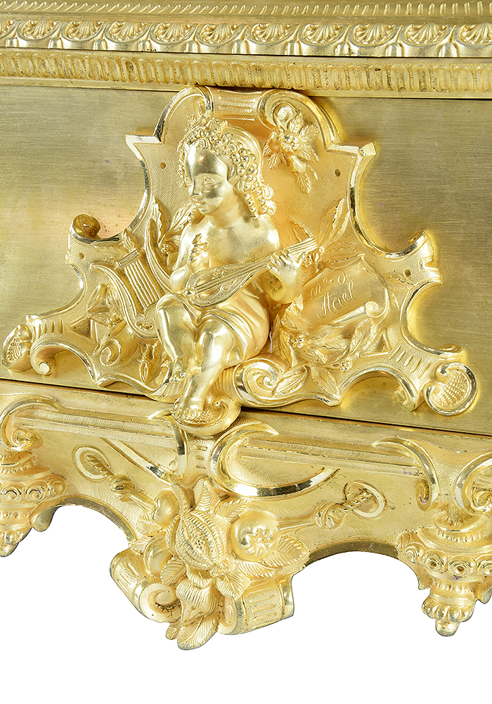 Imposante base sculpté de motifs d’enroulement et ajouré sur les côtés, au centre, réalisation d’un véritable personnage, un joli petit Bacchus, couronné de grappe de raisin. Décor en arrière-plan d’une lyre et d’un parchemin comportant l’inscription « Madame de Staël » connue sous le nom de Germaine de Staël, une écrivaine de la fin du XVIIIème et début XIXème.