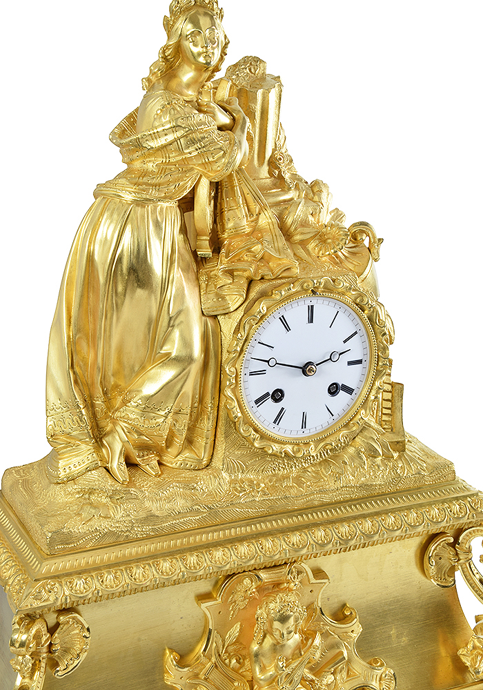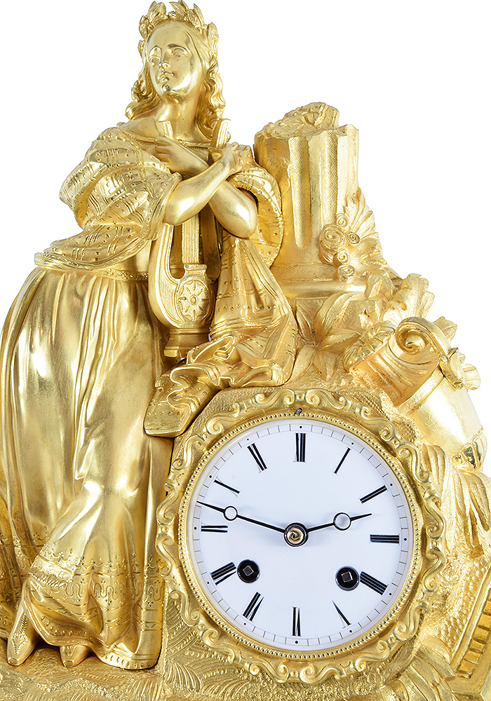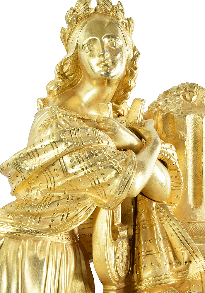 Grande pendule d’excellente qualité en tous point, d’époque Restauration vers 1820. Constitué de bronze, finement et richement ciselé, très belle dorure au mercure. Elégante Muse, finement sculptée, à figure de Erato appuyé sur sa lyre, situé dans un décor en ruine à l’antique. Cadran en émail blanc et ses fines aiguilles souligné par un contour en bronze ciselé.