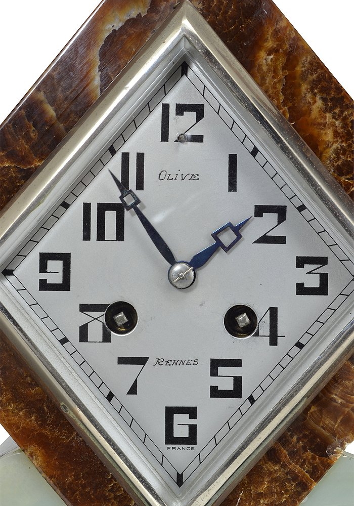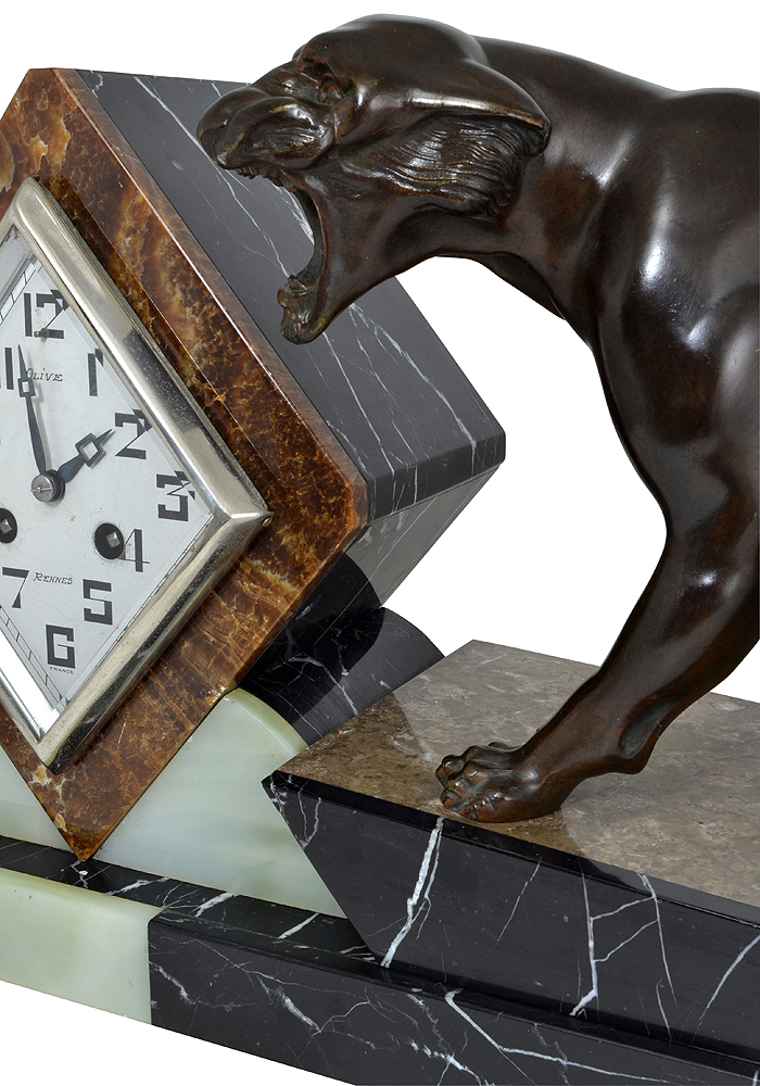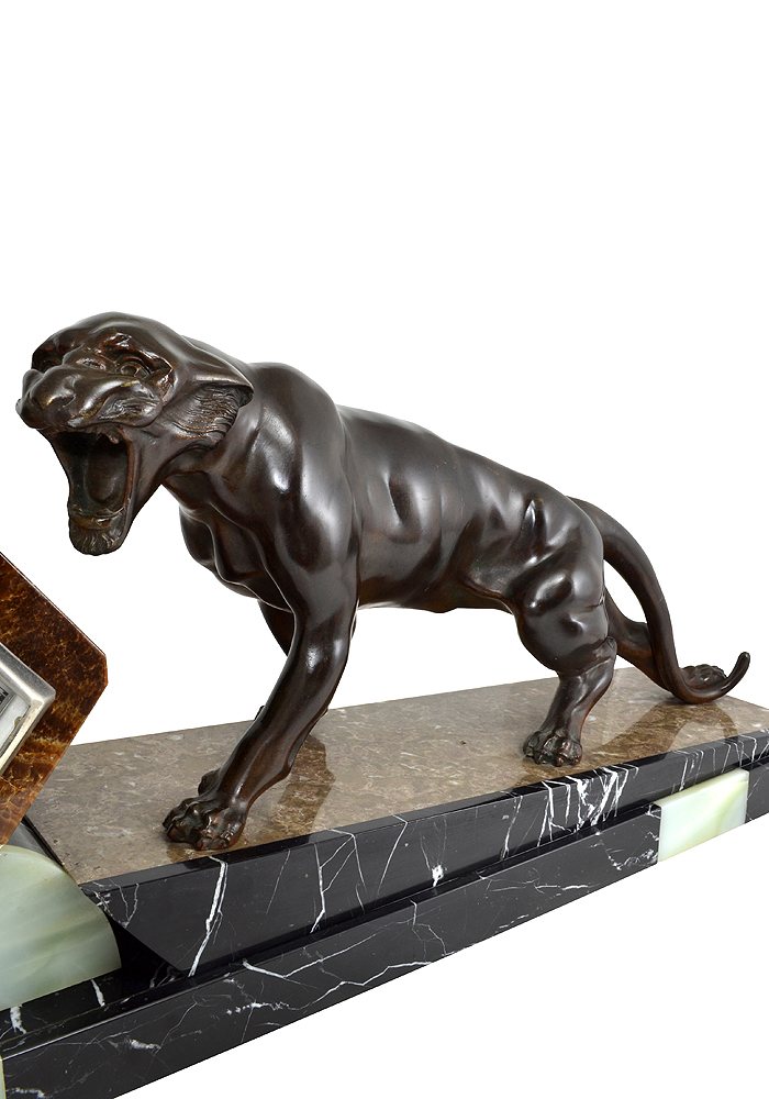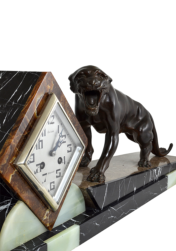 Importante pendule d’époque Art déco signé « Olive rennes » Architecture en onyx de différentes couleurs, le cadran de forme losange argenté est protégé par une lunette chromé serti d’un verre. Large sculpture en régule patiné d’une panthère.
