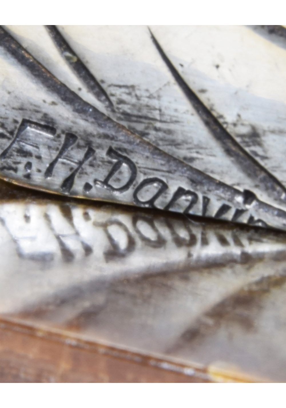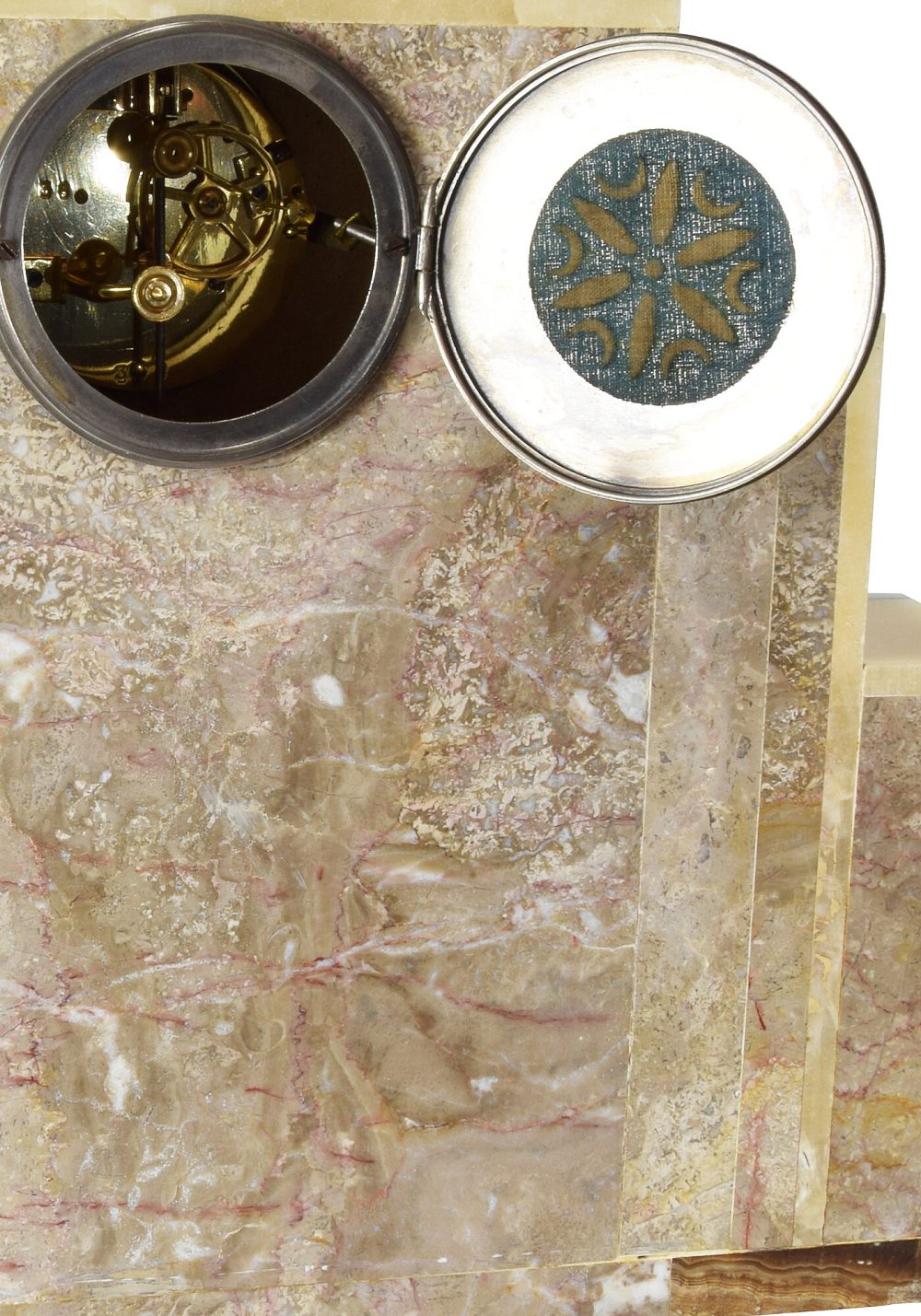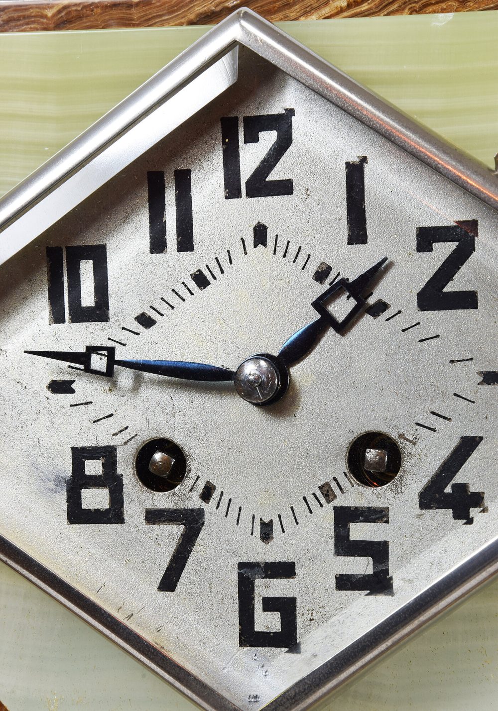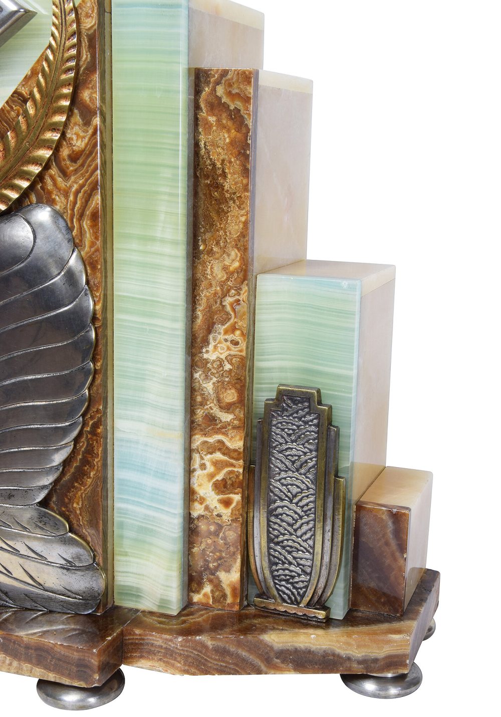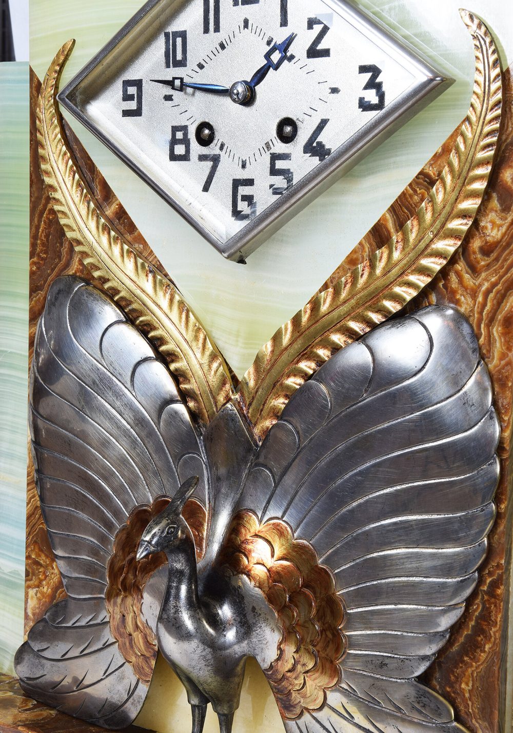 Magnifique pendule d’époque Art Déco signé F. H dandin, bronzier du début XXème spécialisé en bronze animalier. Imposante architecture composé de très beau marbre en onyx de ton vert clair et marron mouchette. Ornementation d’un superbe paon faisant la roue en bronze argenté et patiné. L’ensemble repose sur six pieds ronds en bronze argenté. Cadran en losange, l’ensemble en tôle argenté, protégé par une porte vitrée.