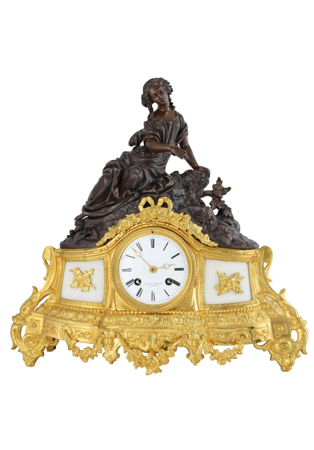 La composition repose sur une architecture symétrique richement structurée, mêlant bronze finement ciselé et doré à des éléments de marbre clair qui apportent contraste et équilibre visuel.